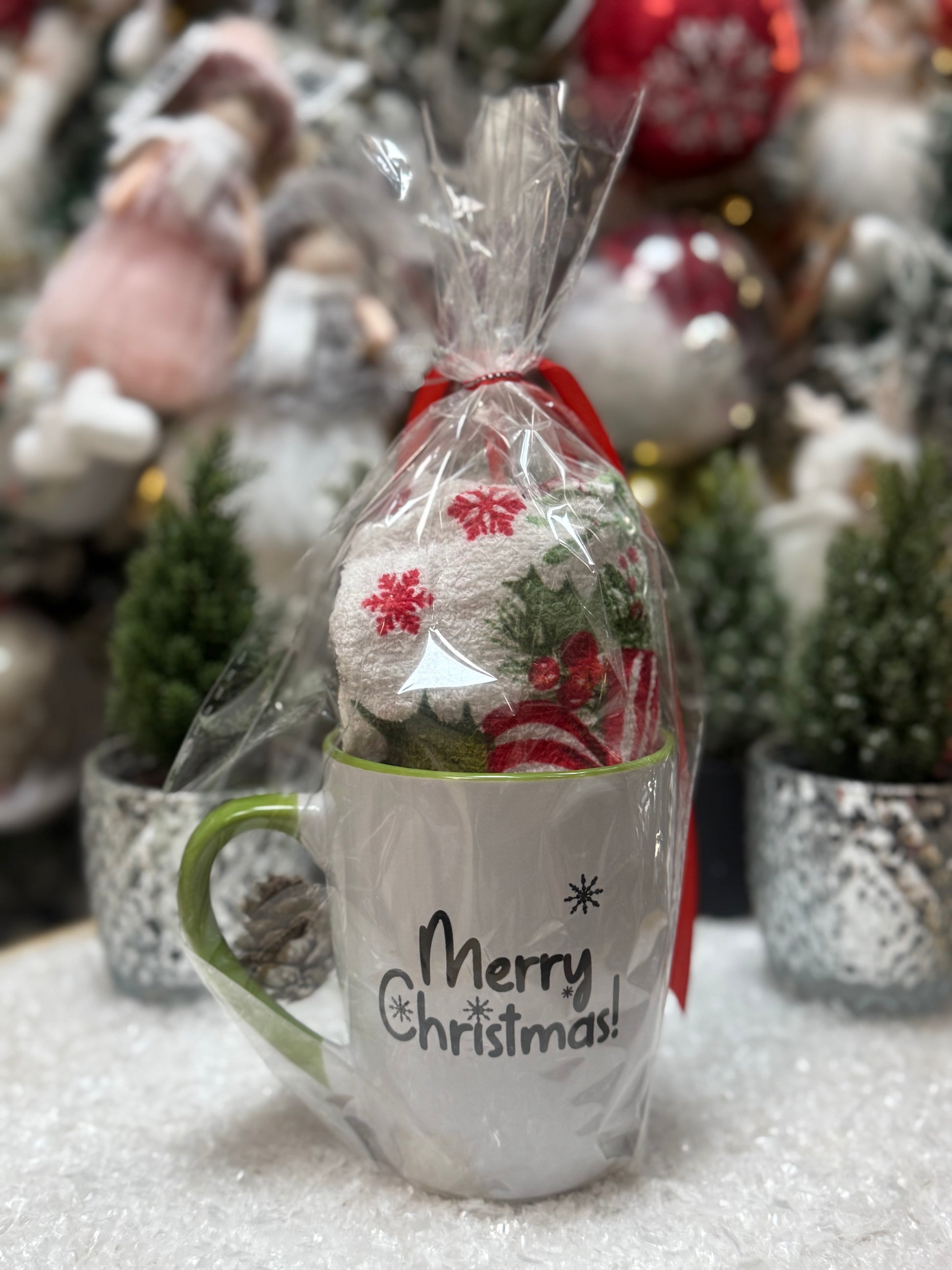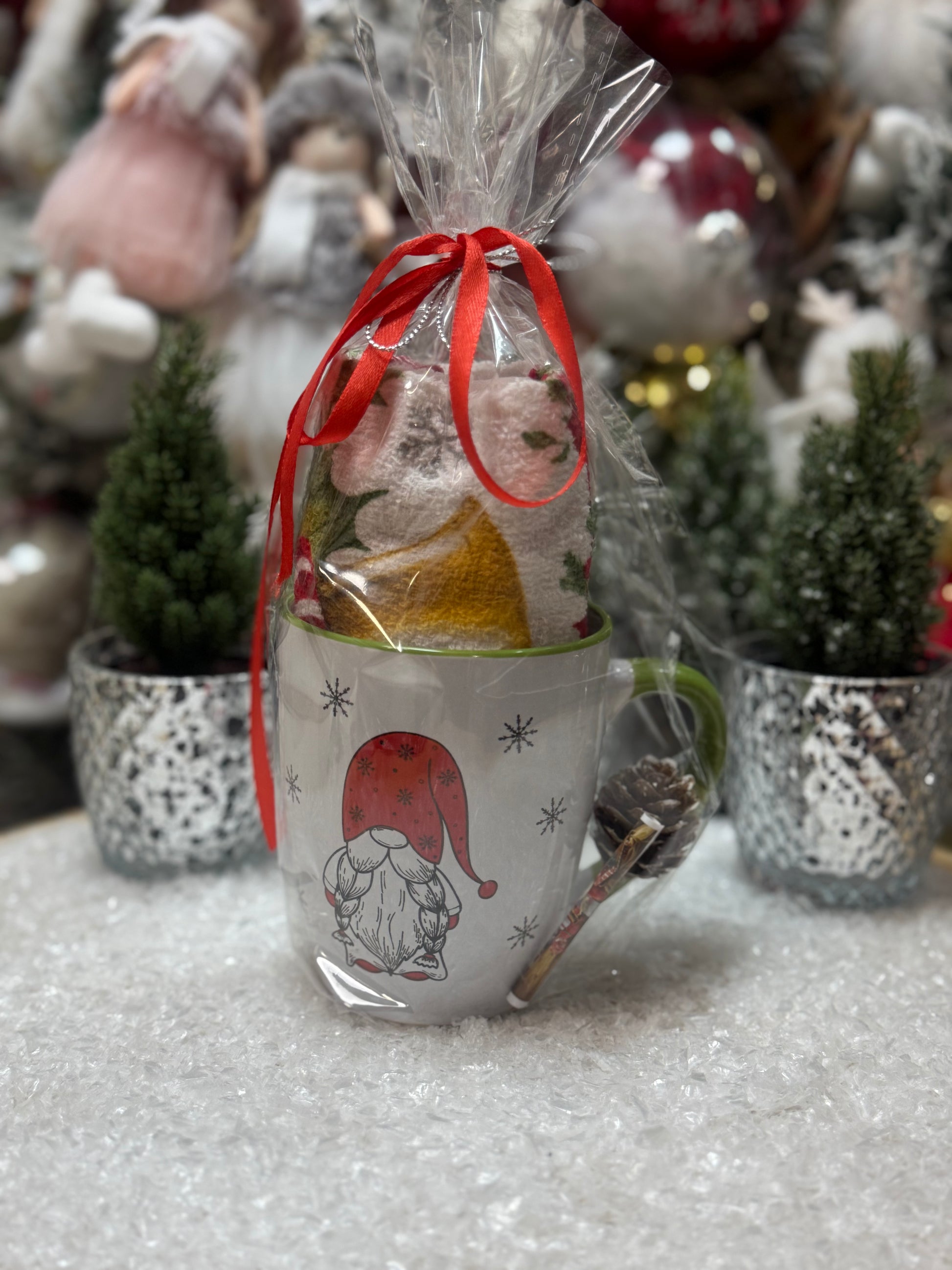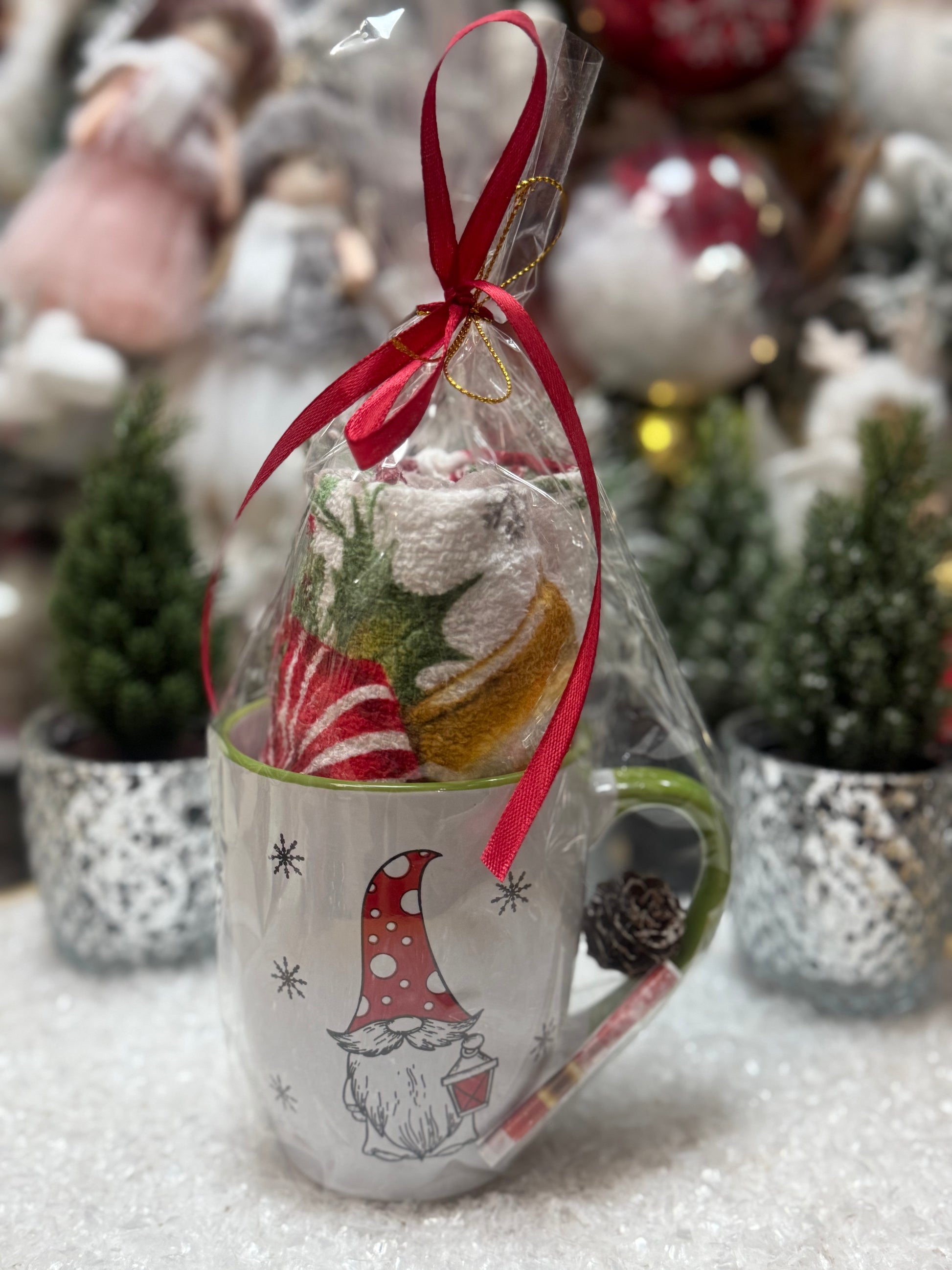 Стилен комплект, включващ чаша с коледни мотиви, хавлиена кърпа за ръце в празничен дизайн, декоративна шишарка и късметче. Всичко е красиво подредено и опаковано в целофан – готово за подаряване. Идеален празничен жест за близки, колеги или гости.