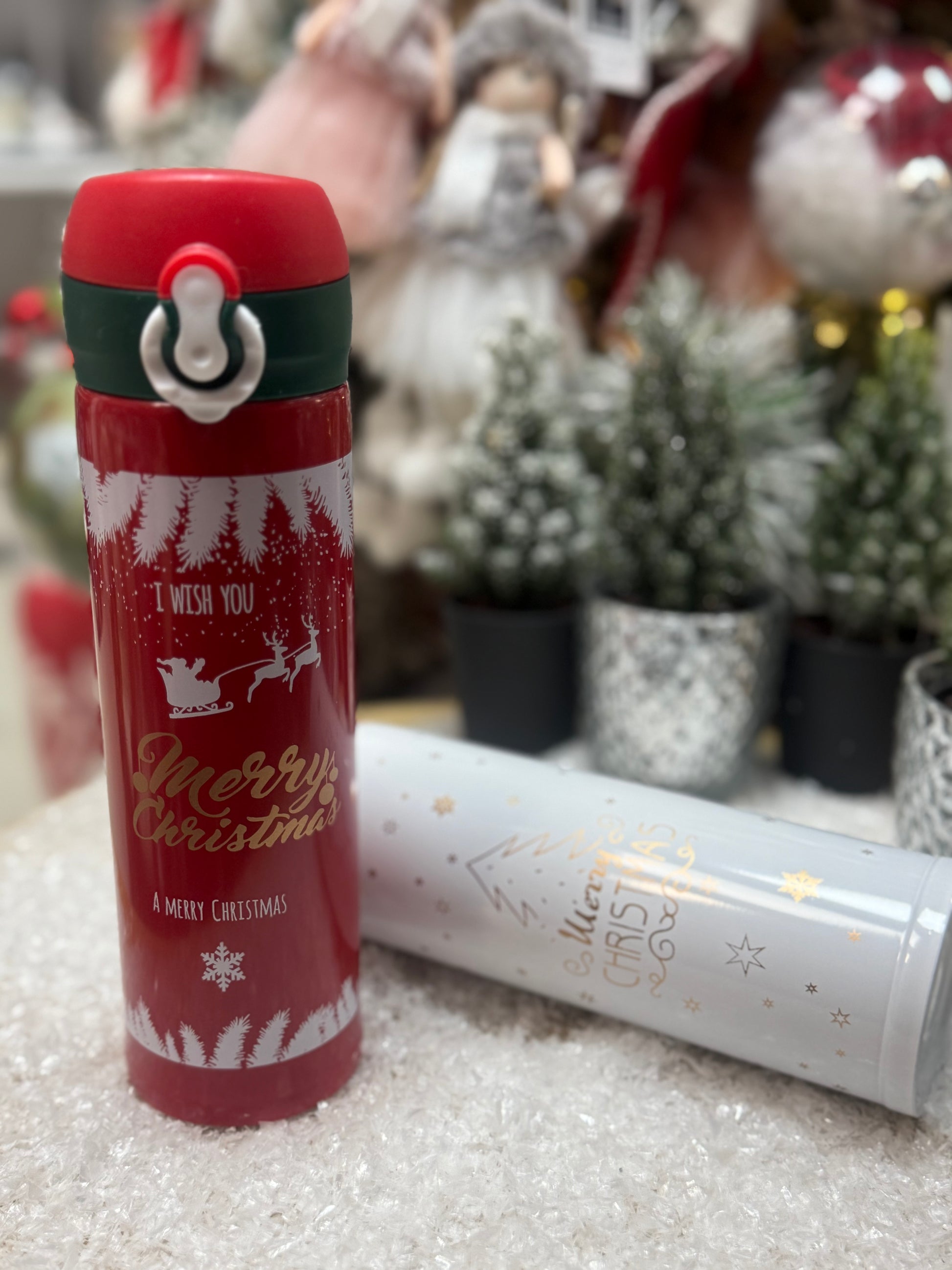 Практичен и стилен термос с празнични коледни мотиви, идеален за топли напитки през зимните дни. Удобен за носене и перфектен като сезонен подарък или допълнение към коледната атмосфера.