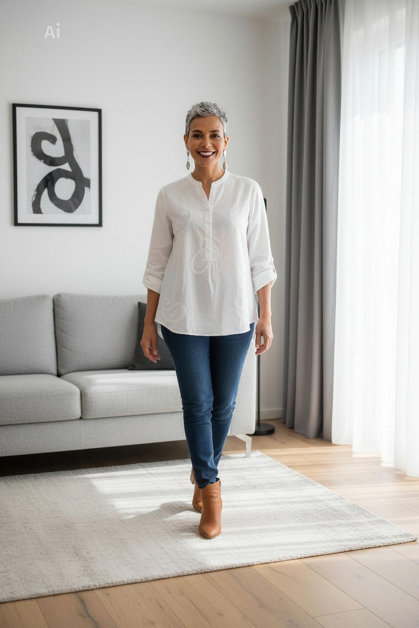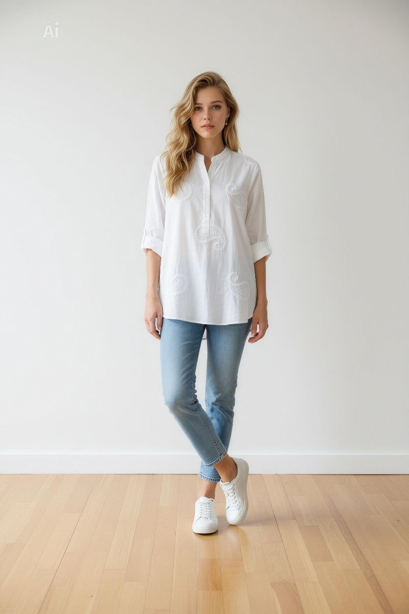 Елегантна бяла риза със свободна кройка и фино релефни бродерии, които придават нежен и изискан акцент. Моделът е с изчистено деколте тип яка и подгъващи се ръкави, подходящ както за ежедневна визия, така и за по-стилен аутфит. Лека и комфортна материя, идеална за свежа и женствена визия.