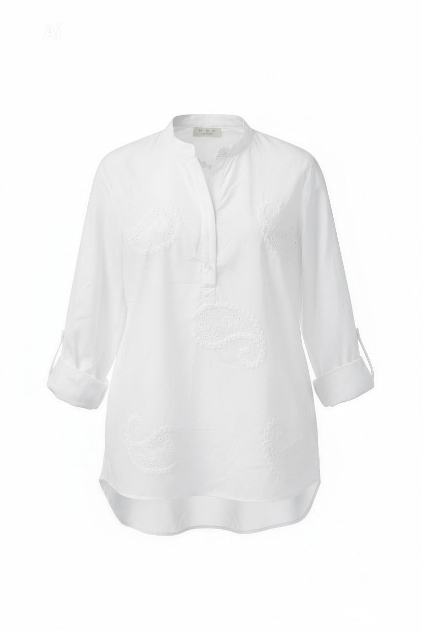 Елегантна бяла риза със свободна кройка и фино релефни бродерии