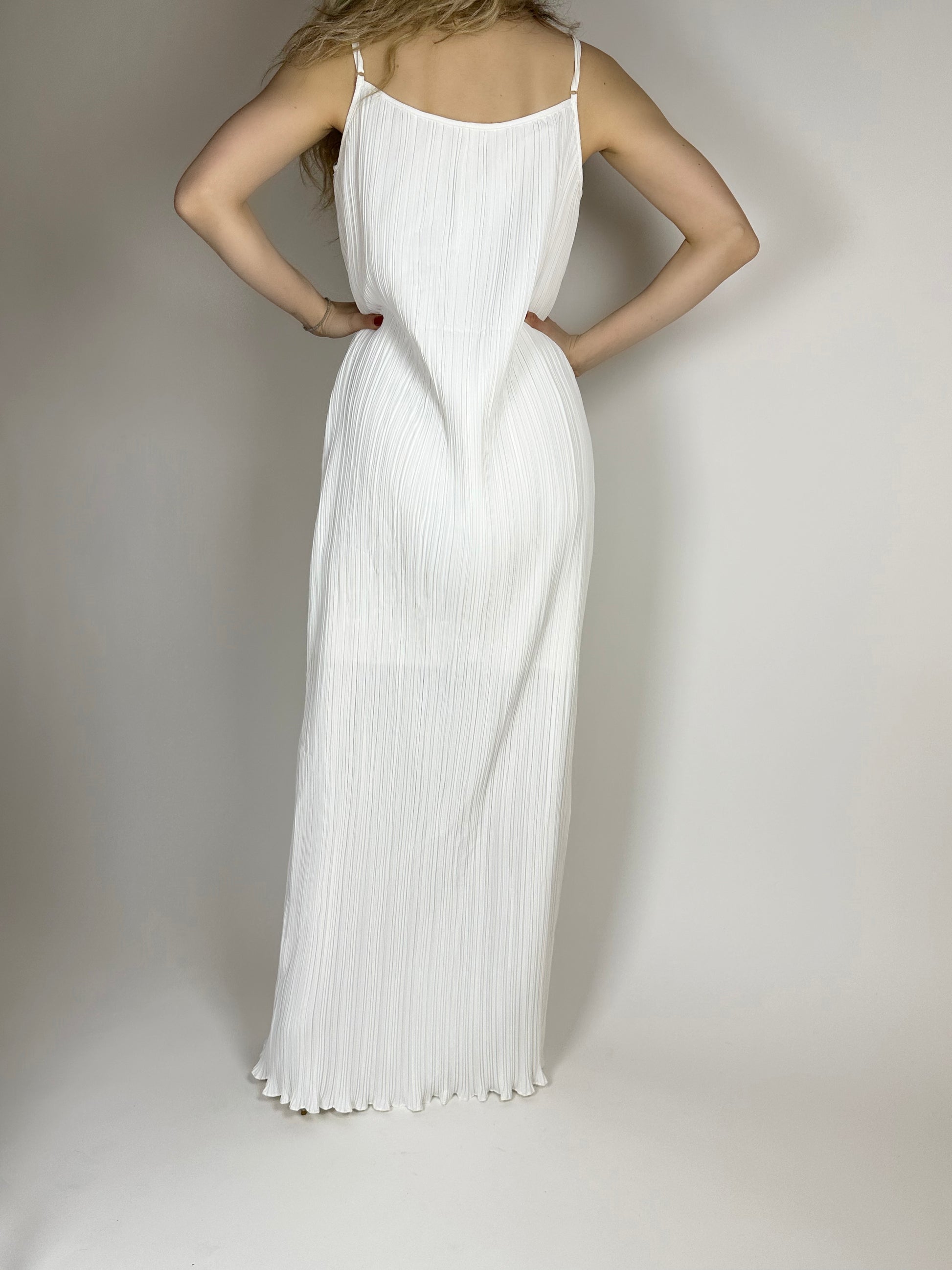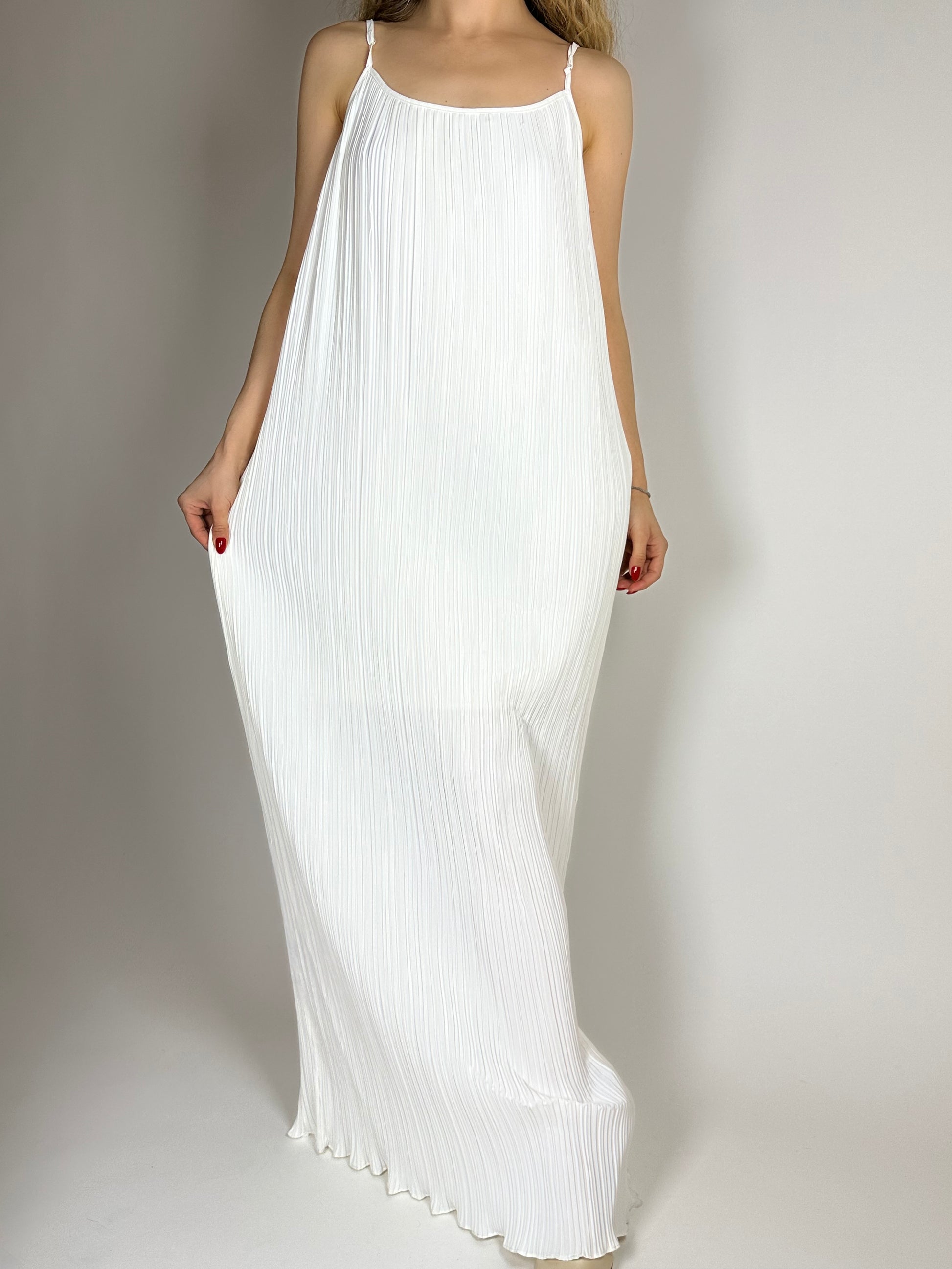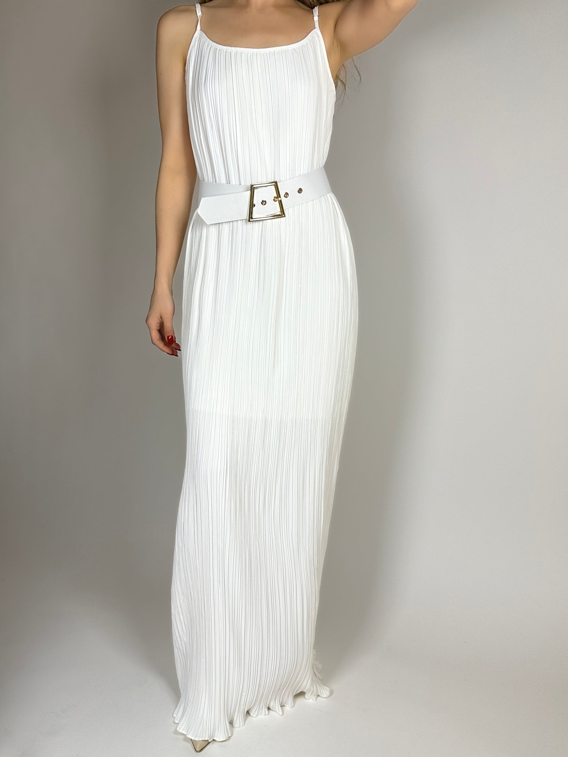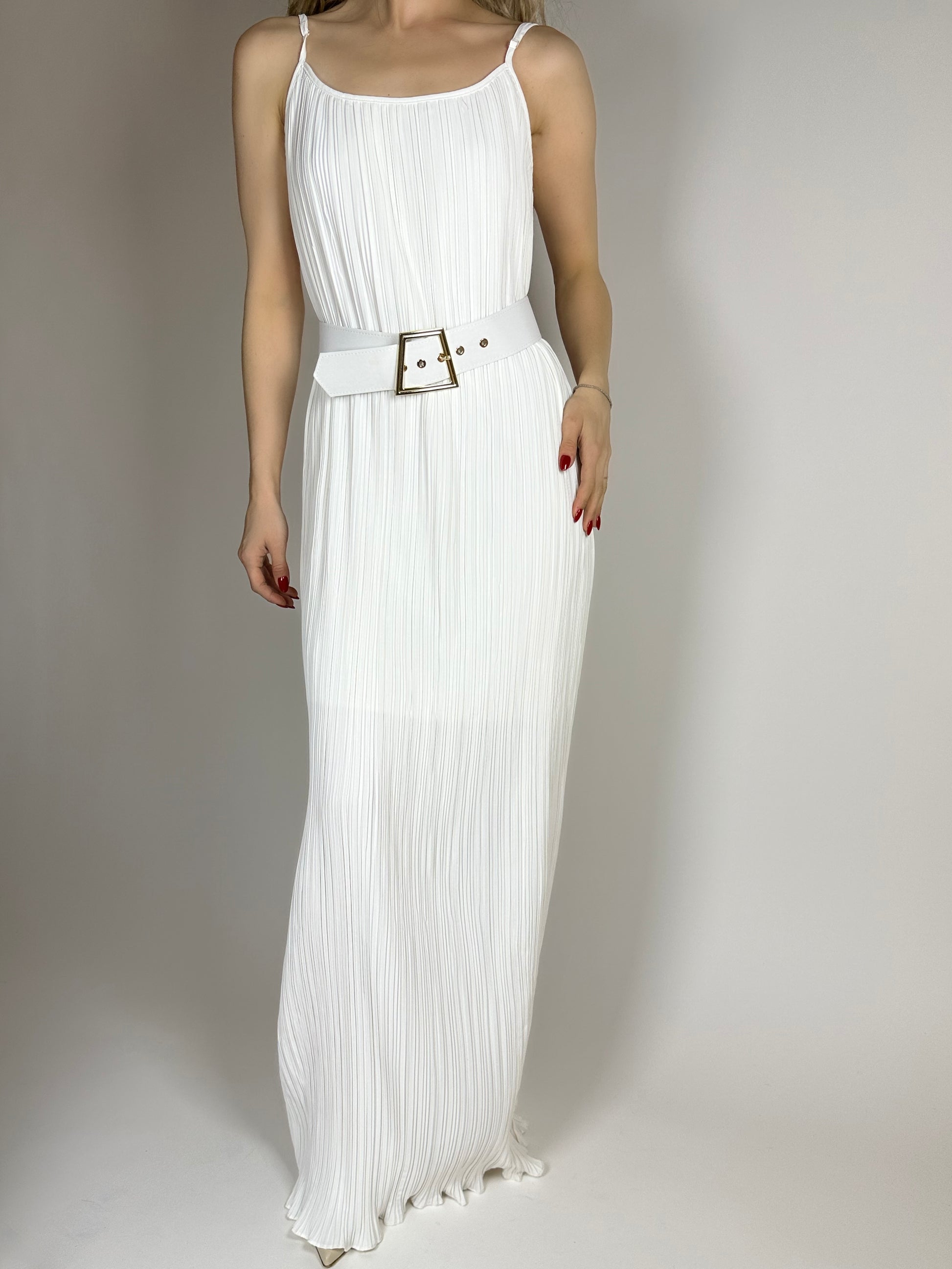 Роклята съчетава женственост и комфорт, а широкия колан подчертава талията