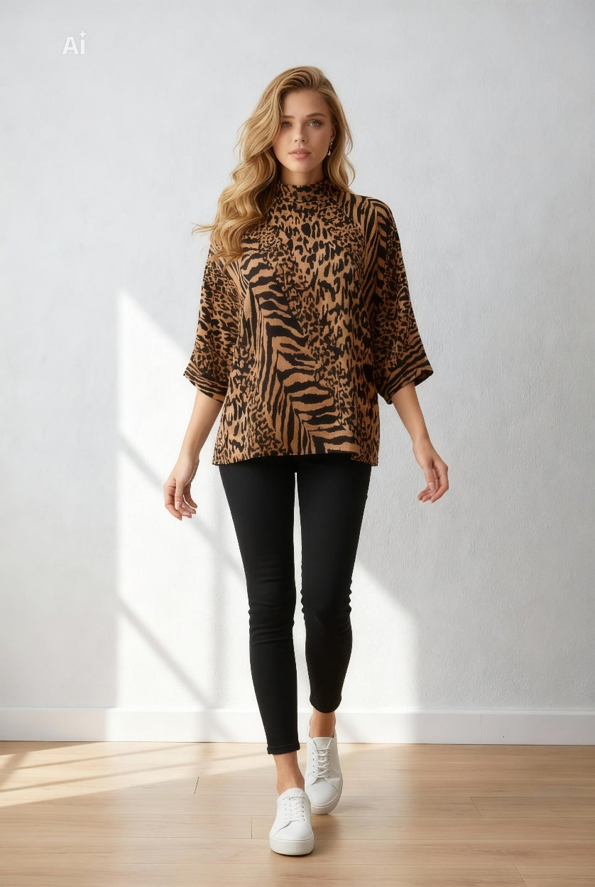 Ексклузивна дамска блуза с артистичен анималистичен принт, създадена за жени с усет към лукса и модерния силует. Свободната дизайнерска линия, комбинирана с изчистено високо деколте и 3/4 ръкави, придава изискано и уверено присъствие. Меката материя създава усещане за комфорт и стил от висок клас.