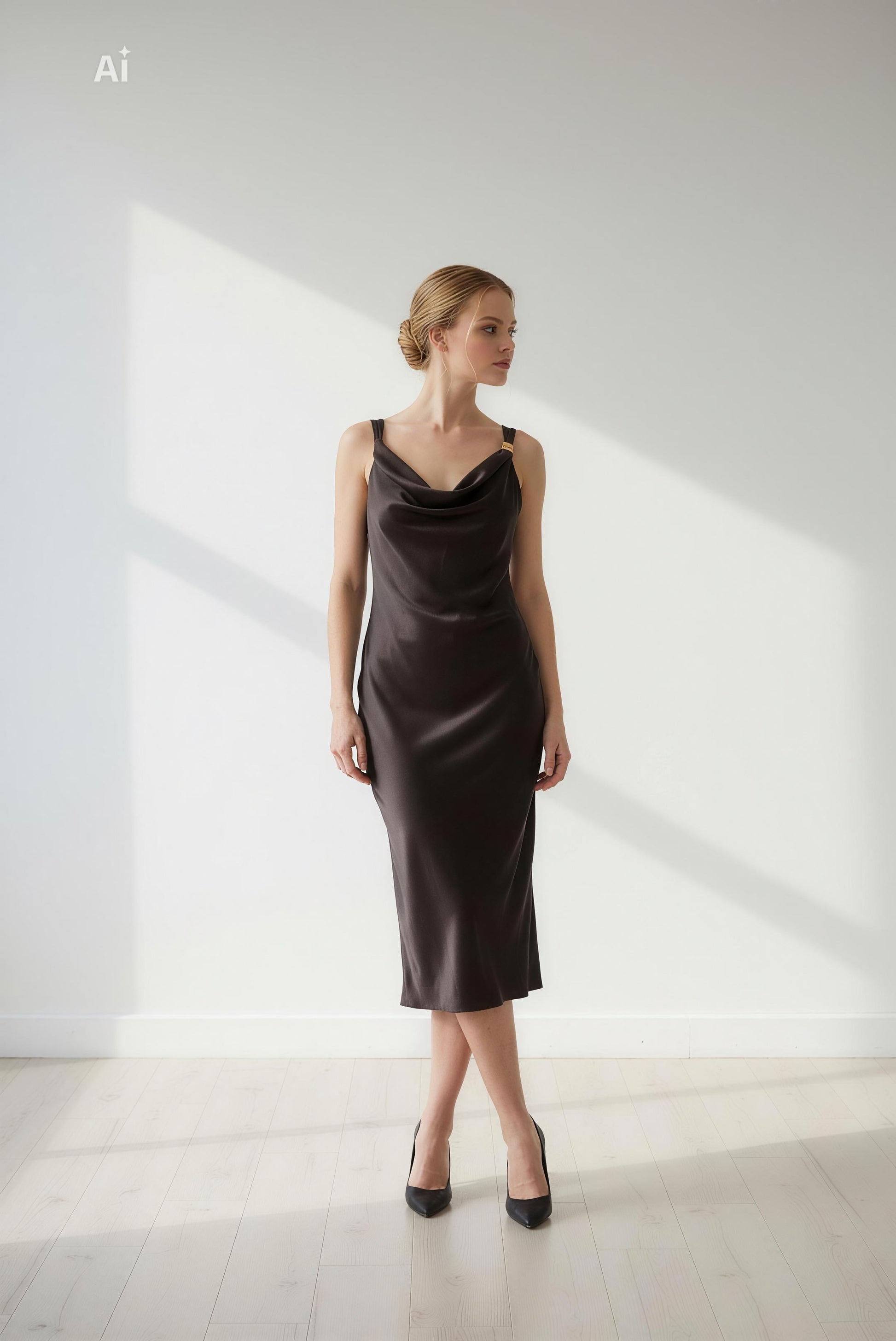 Бутикова рокля със сатенен финиш и елегантно падащо деколте, което подчертава линията на тялото с фина чувственост. Изчистеният силует и луксозното излъчване превръщат модела в изискан избор за специални поводи и модерна вечерна визия.