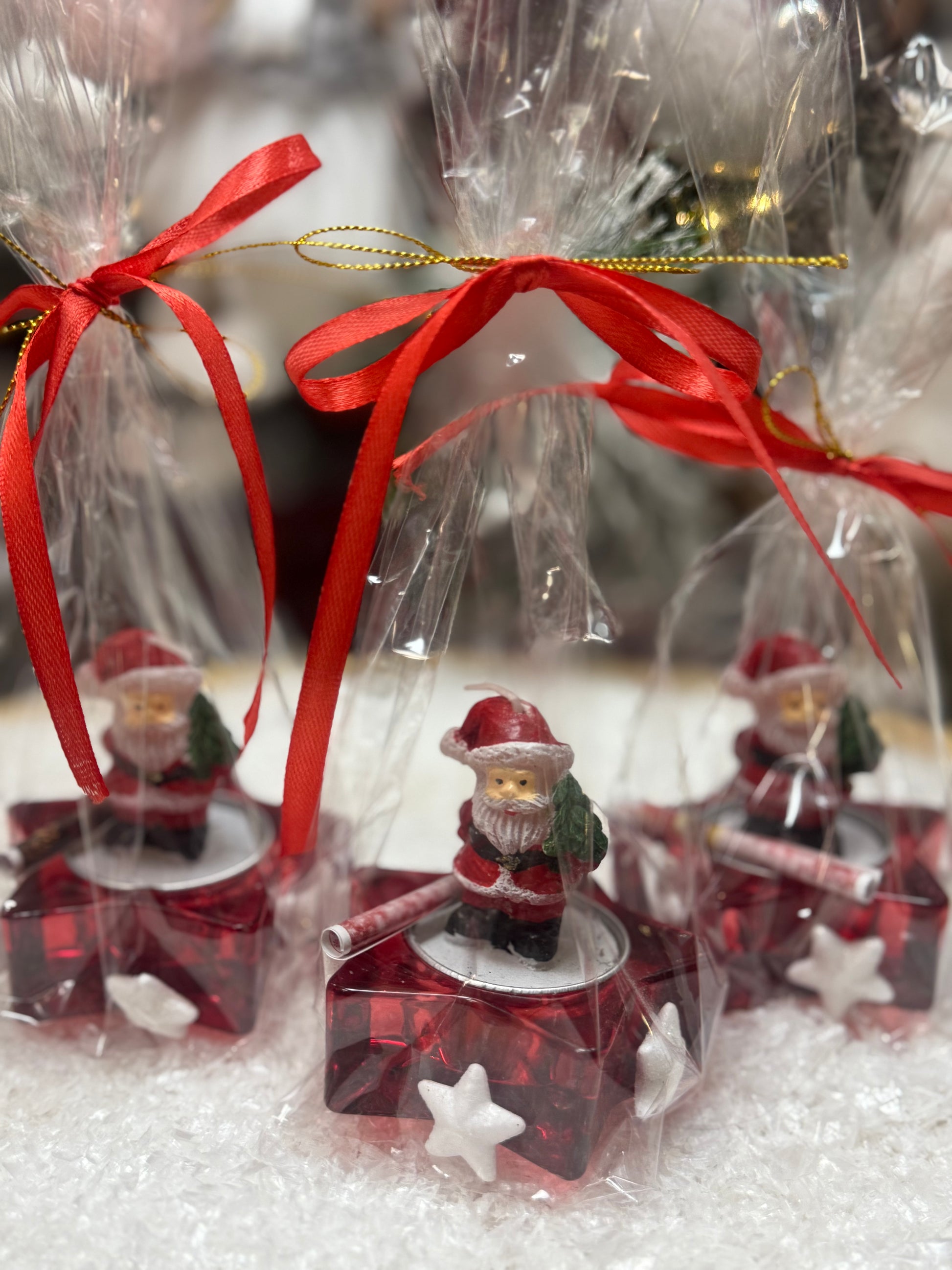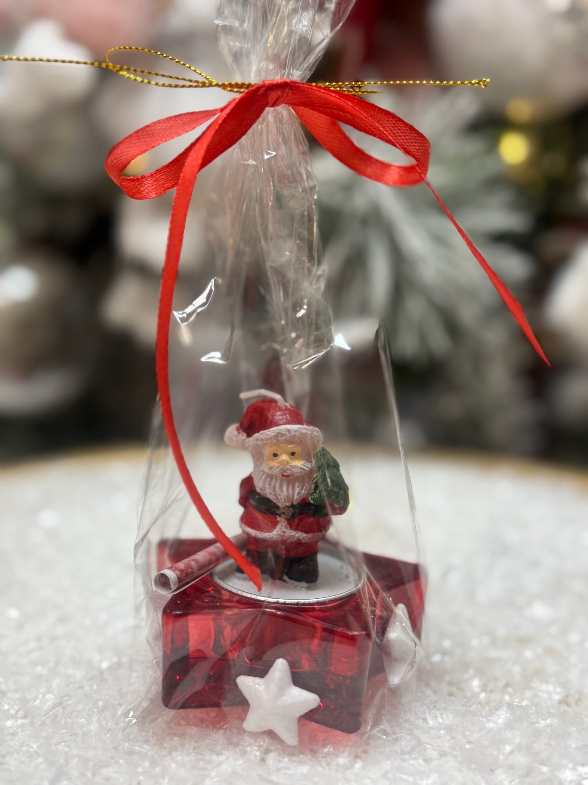 Очарователна чаена свещ с фигурка на Дядо коледа, поставена върху свещник във формата на звезда. Комплектът е красиво опакован в целофан и е перфектен като малък, стилен и празничен подарък.