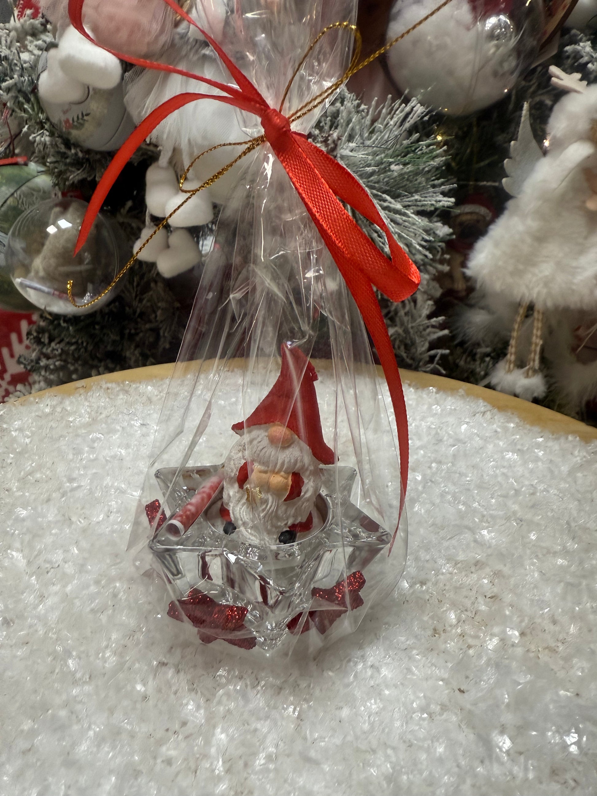 Очарователна чаена свещ с фигурка на гномче, поставена върху свещник във формата на звезда. Комплектът е красиво опакован в целофан и е перфектен като малък, стилен и празничен подарък.