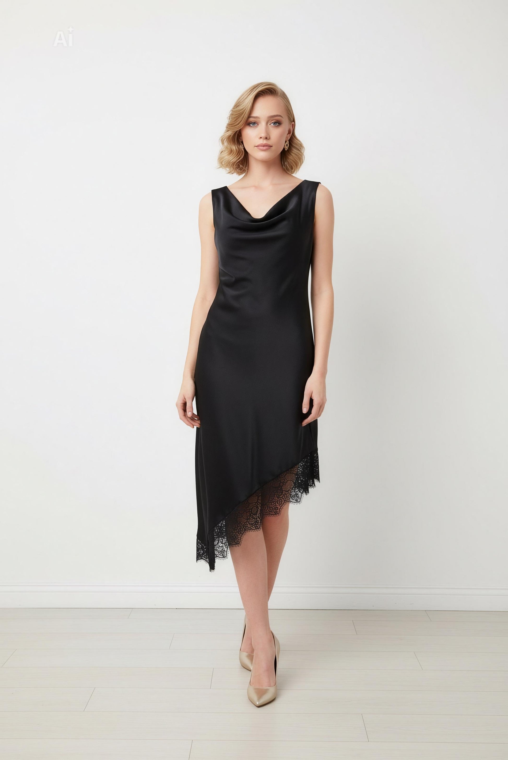 Елегантна черна рокля със сатенен блясък и изящно падащо деколте, което подчертава силуета с фина женственост. Асиметричният подгъв с деликатна дантела добавя бутиков акцент и превръща модела в стилен избор за специални поводи.