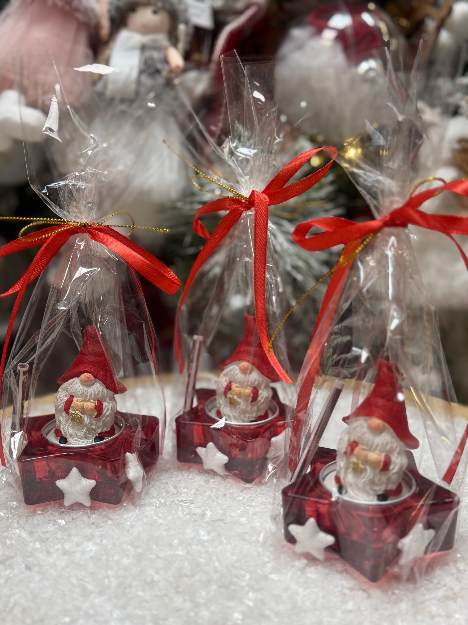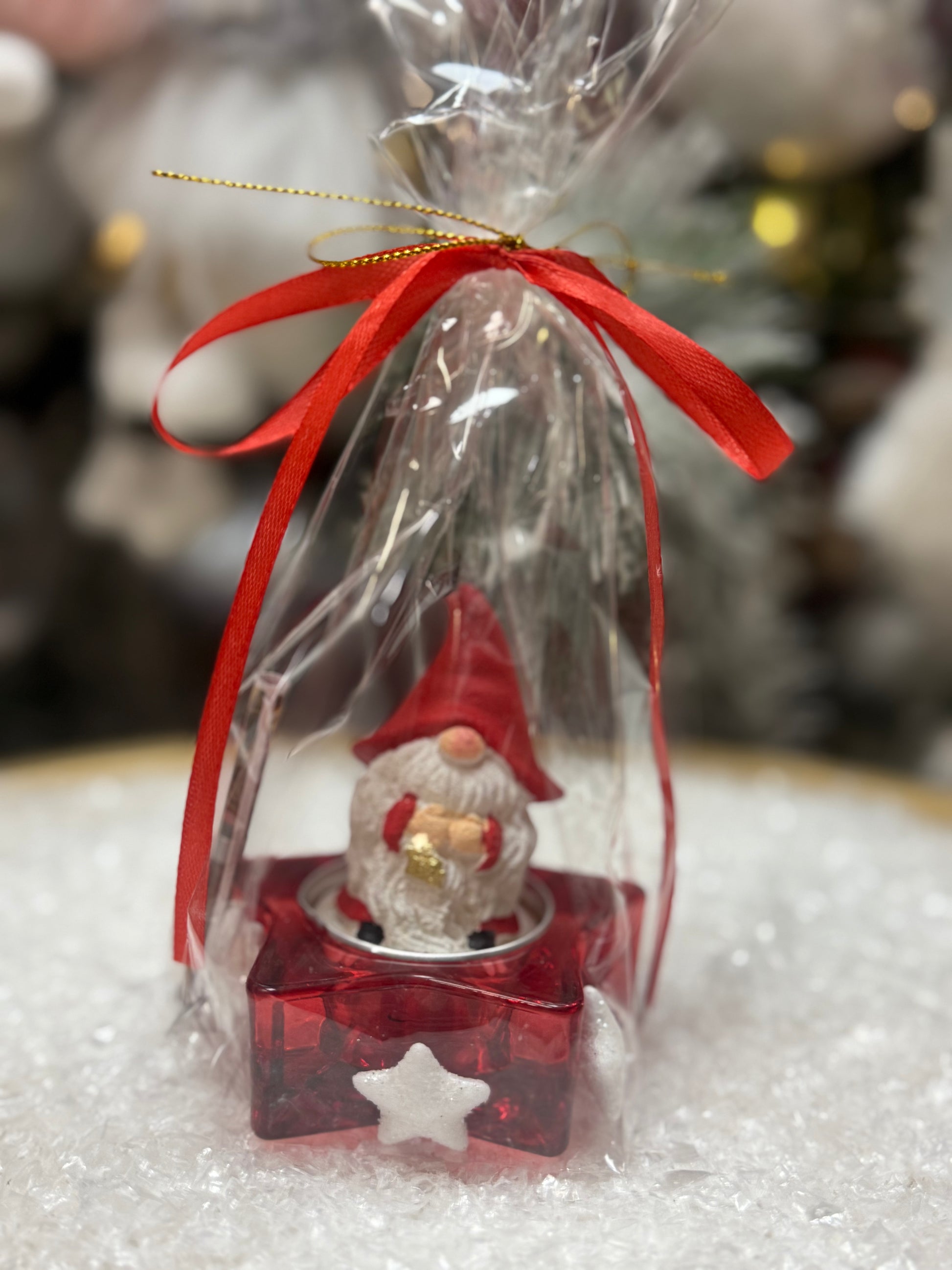 Очарователна чаена свещ с фигурка на гномче, поставена върху свещник във формата на звезда. Комплектът е красиво опакован в целофан и е перфектен като малък, стилен и празничен подарък.