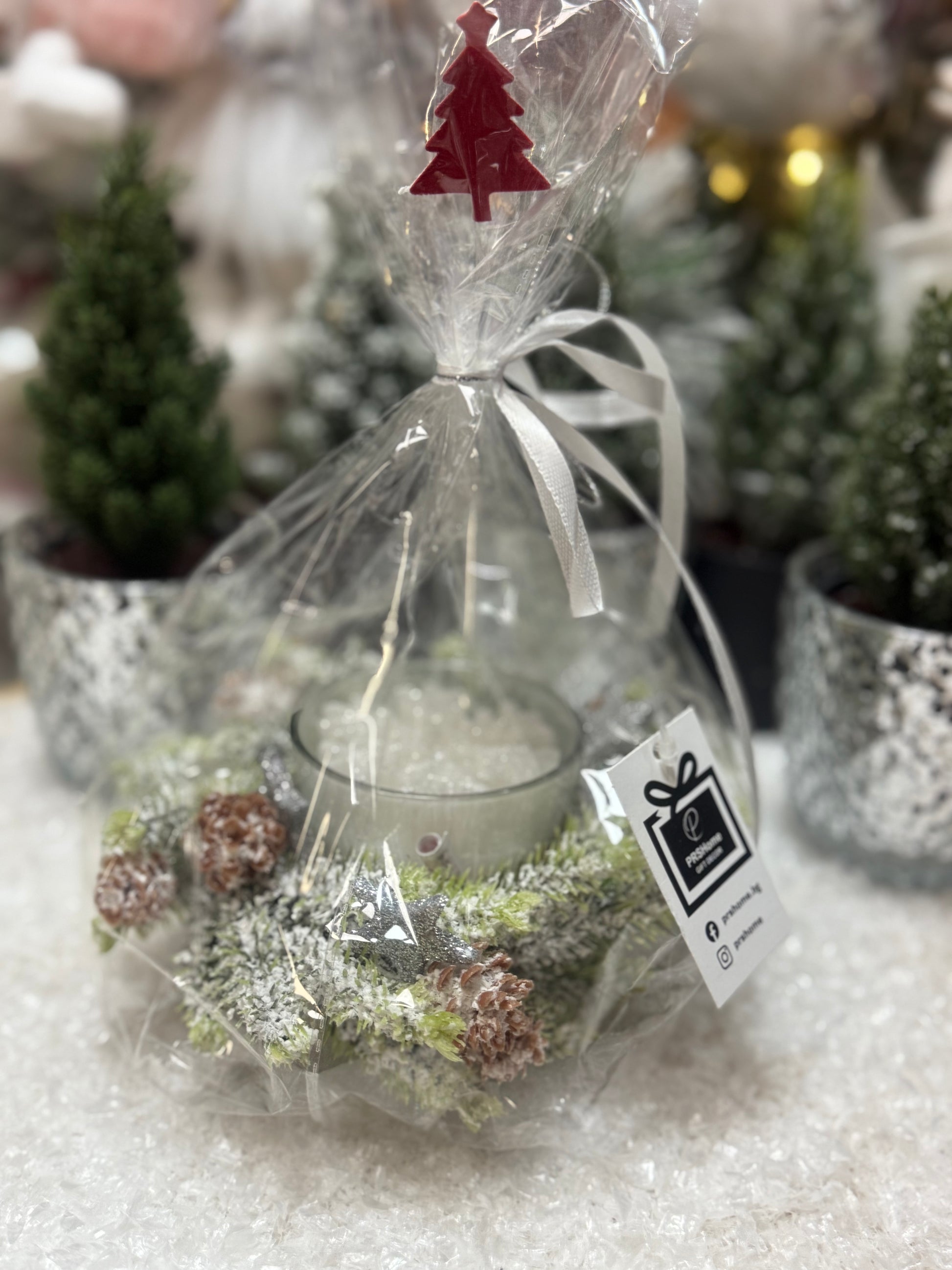 Очарователна чаена свещ във форма на снежинка, разположена в декоративен коледен венец. Компактна, стилно опакована и напълно готова за подарък. Идеален малък акцент за празнична украса и уютна атмосфера у дома.