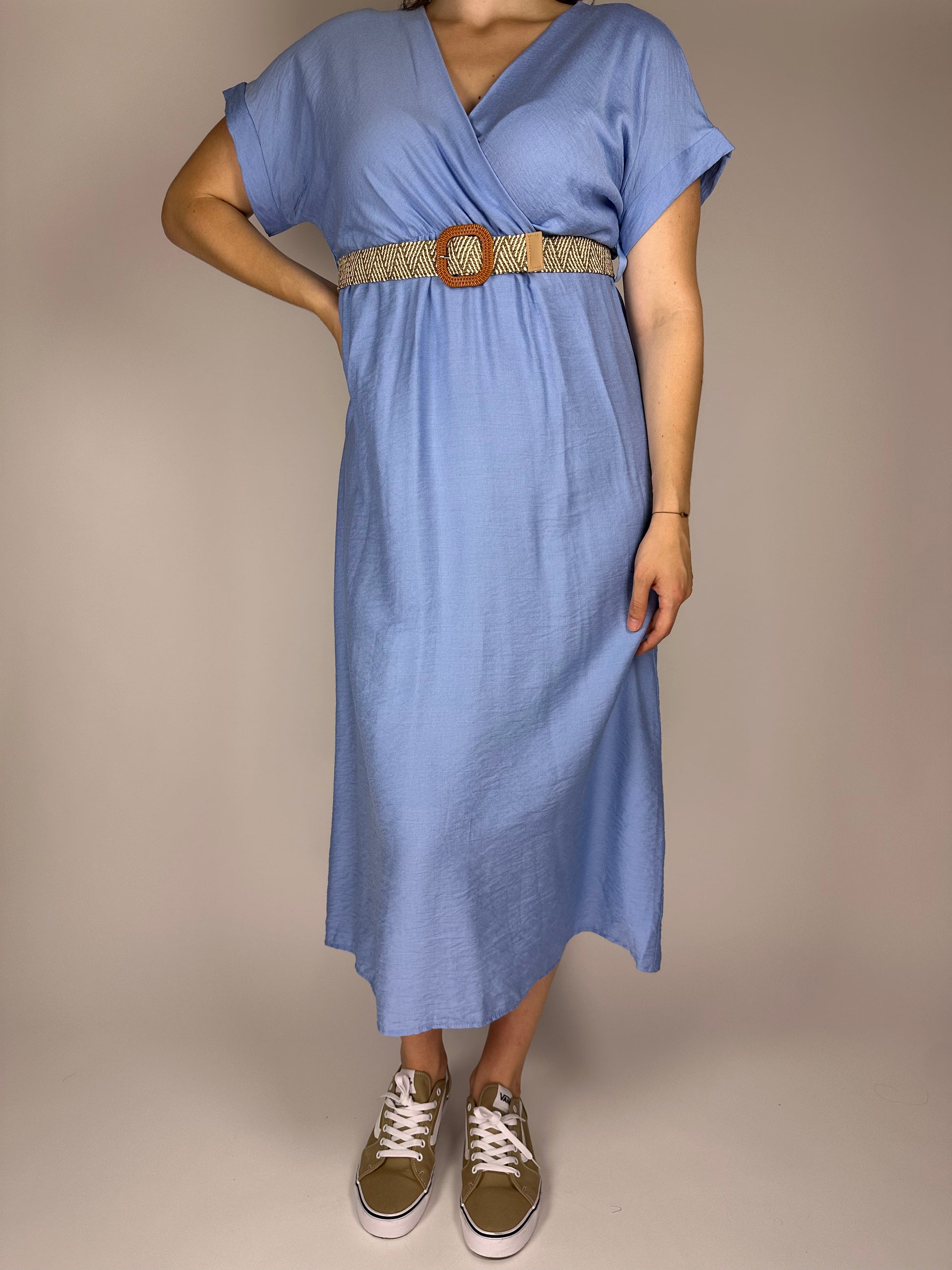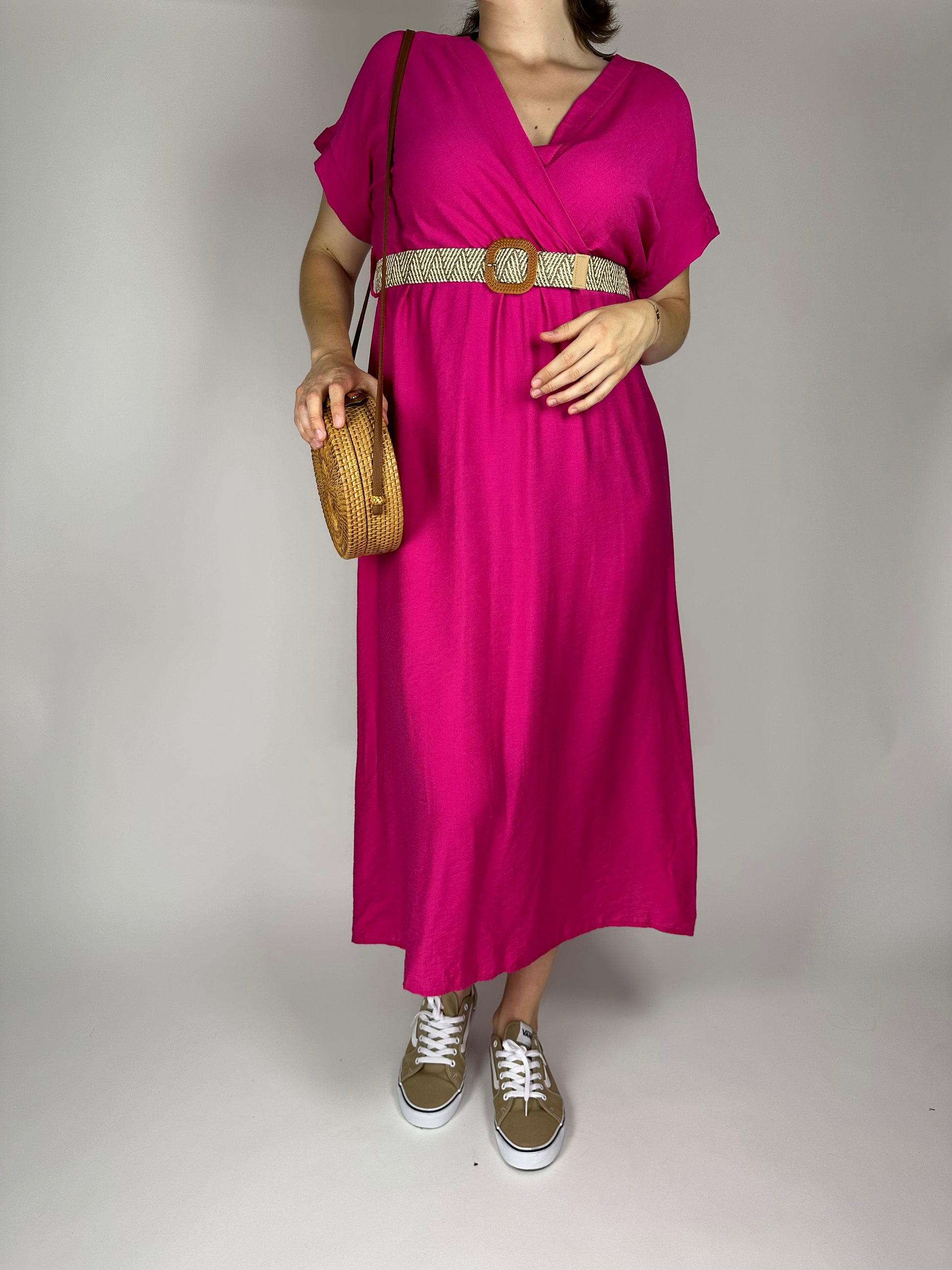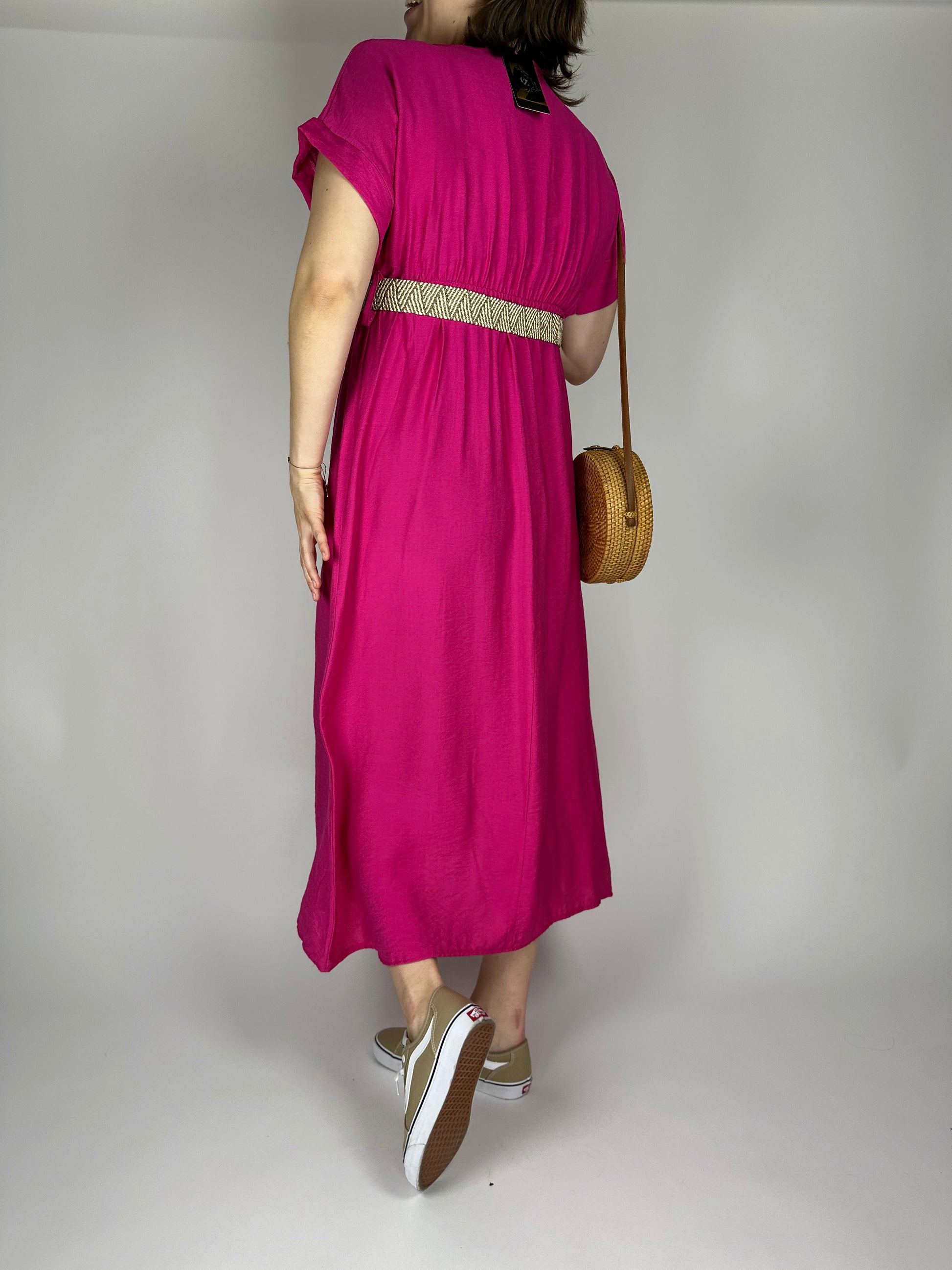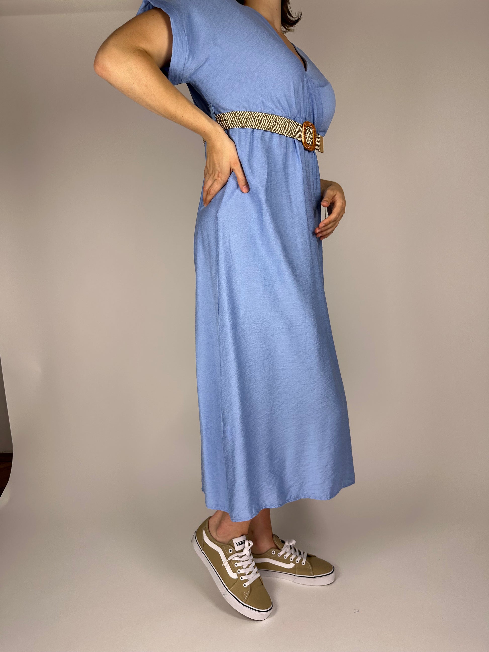 Дълга лятна рокля от висококачествена вискоза – едноцветна, лека и ефирна, с ластик и коланче под бюста за подчертаване на талията. Свободната кройка и естествената материя осигуряват комфорт и прохлада през летните дни. Идеален избор за елегантна и женствена визия.