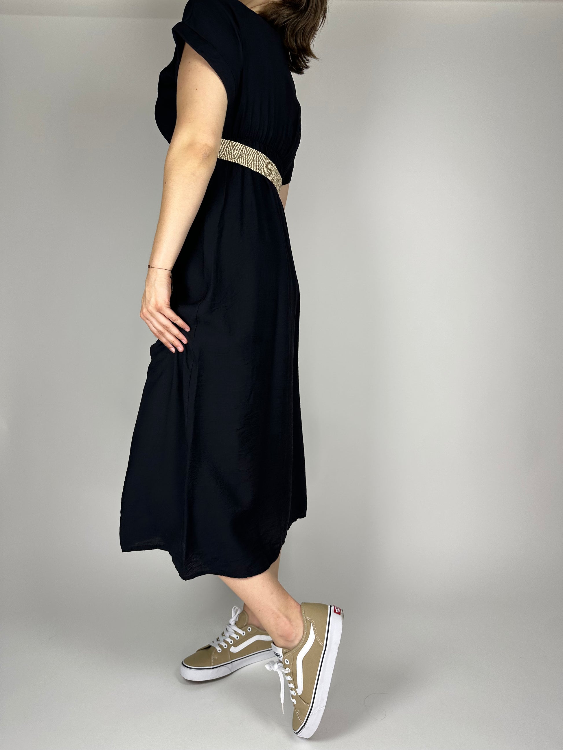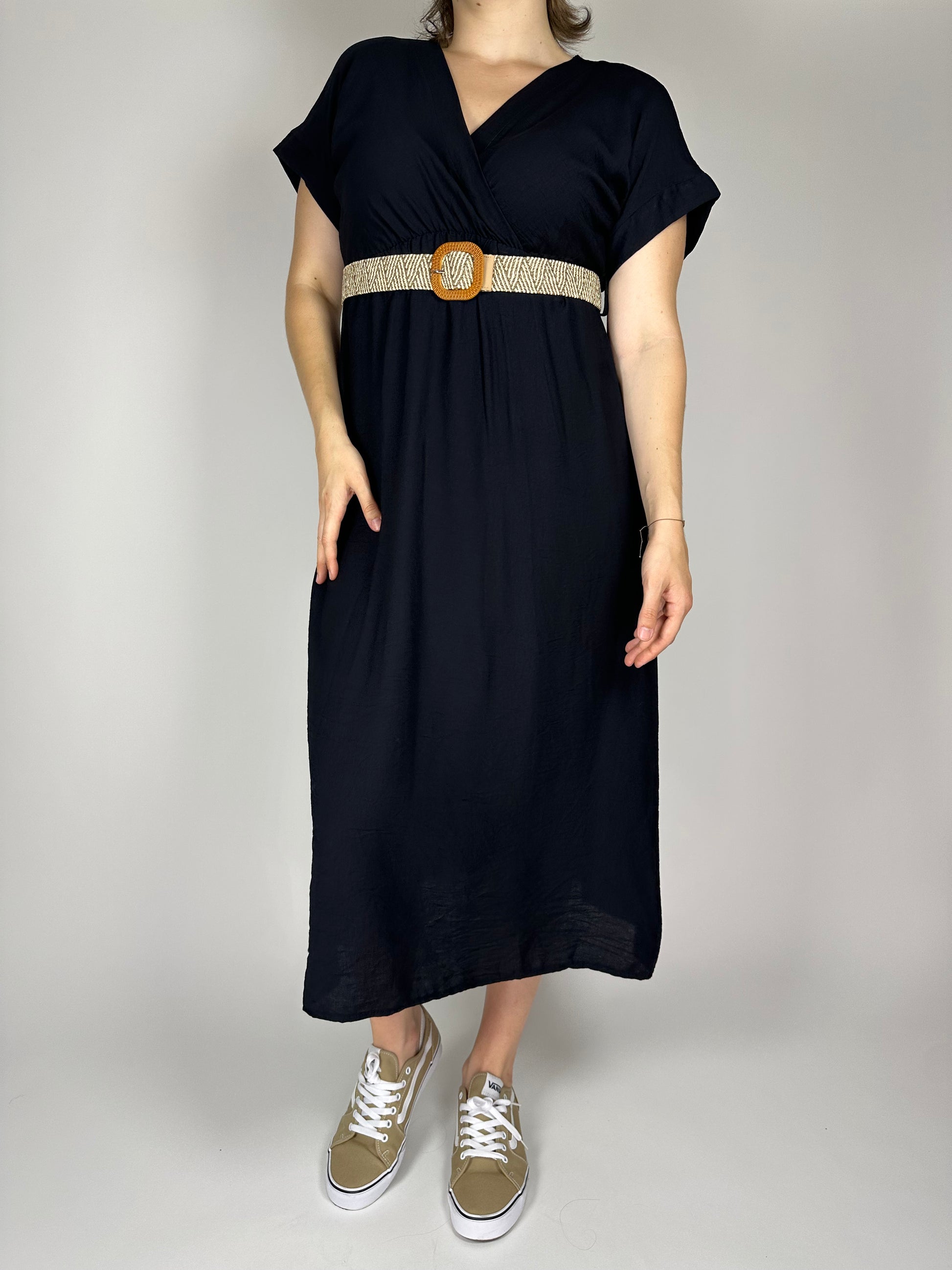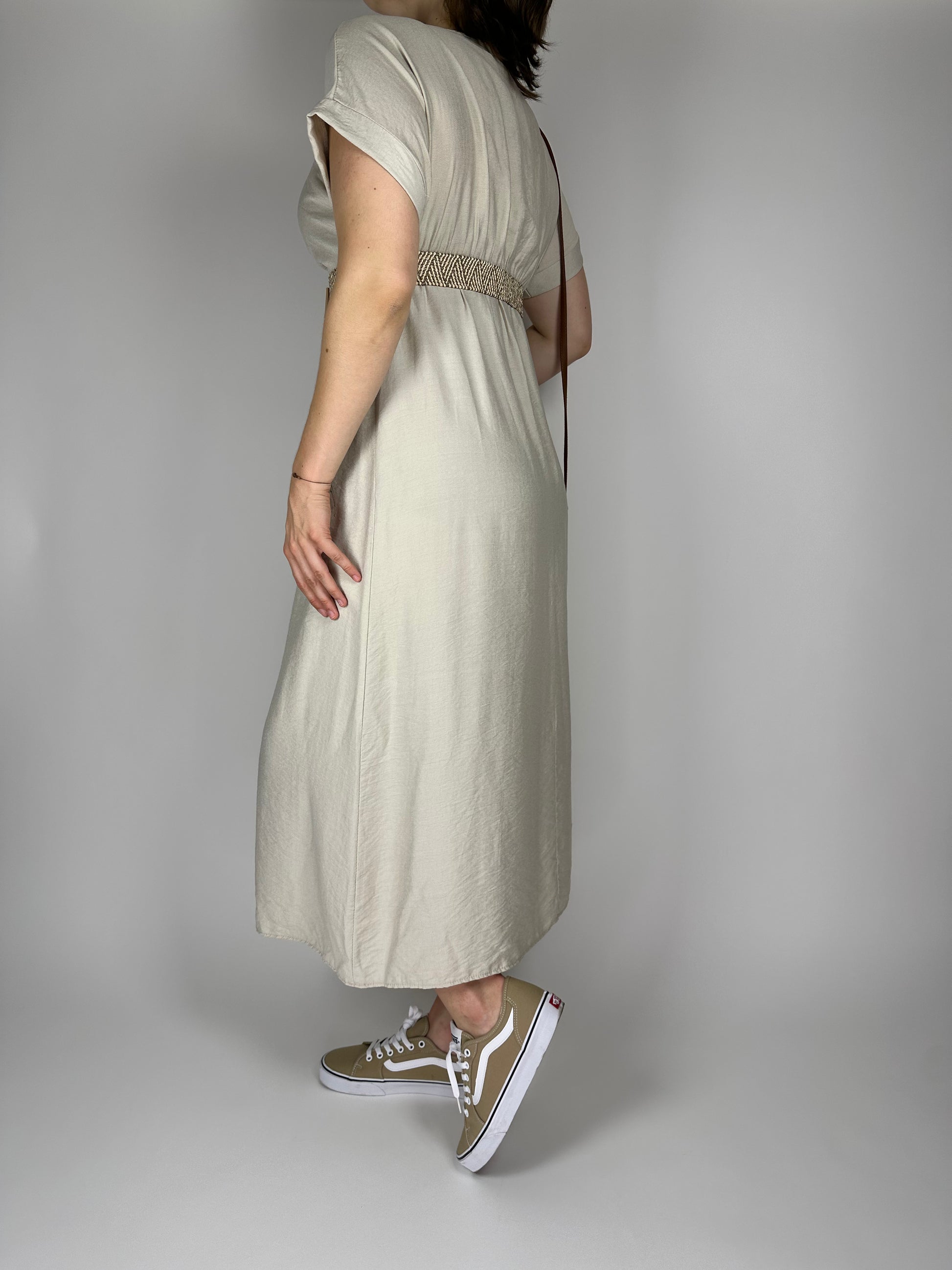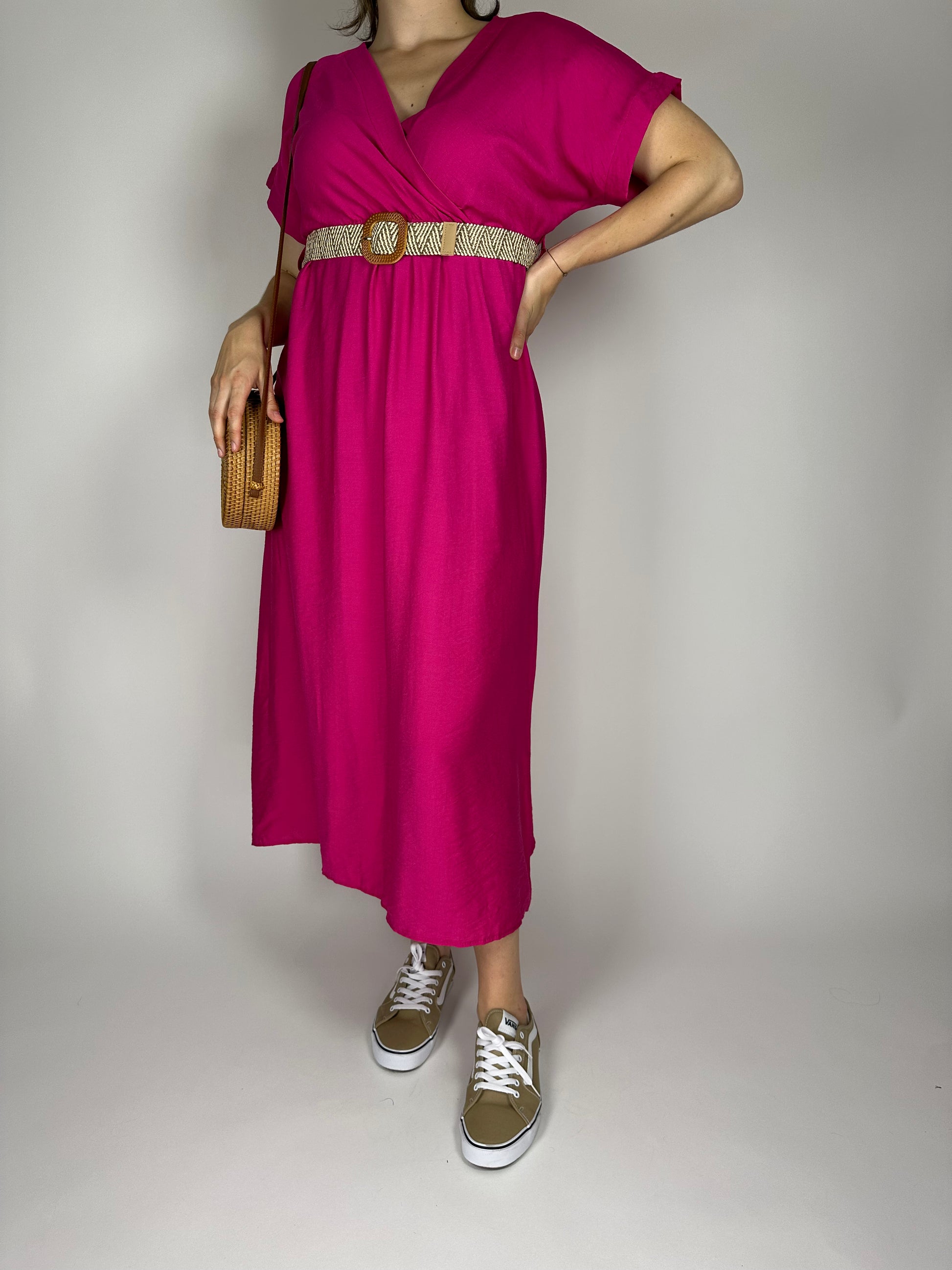 Дълга лятна рокля от висококачествена вискоза – едноцветна, лека и ефирна, с ластик и коланче под бюста за подчертаване на талията. Свободната кройка и естествената материя осигуряват комфорт и прохлада през летните дни. Идеален избор за елегантна и женствена визия.