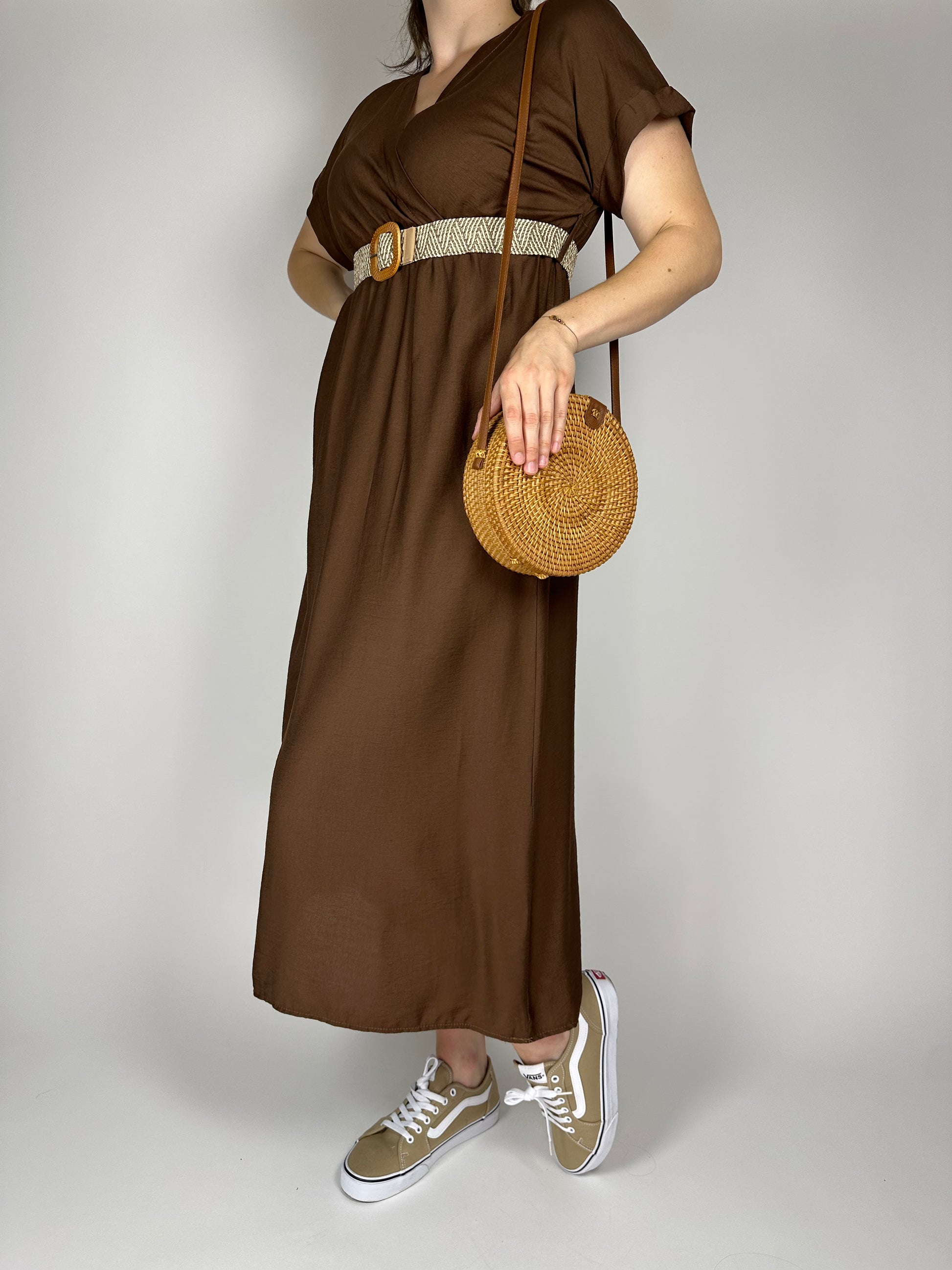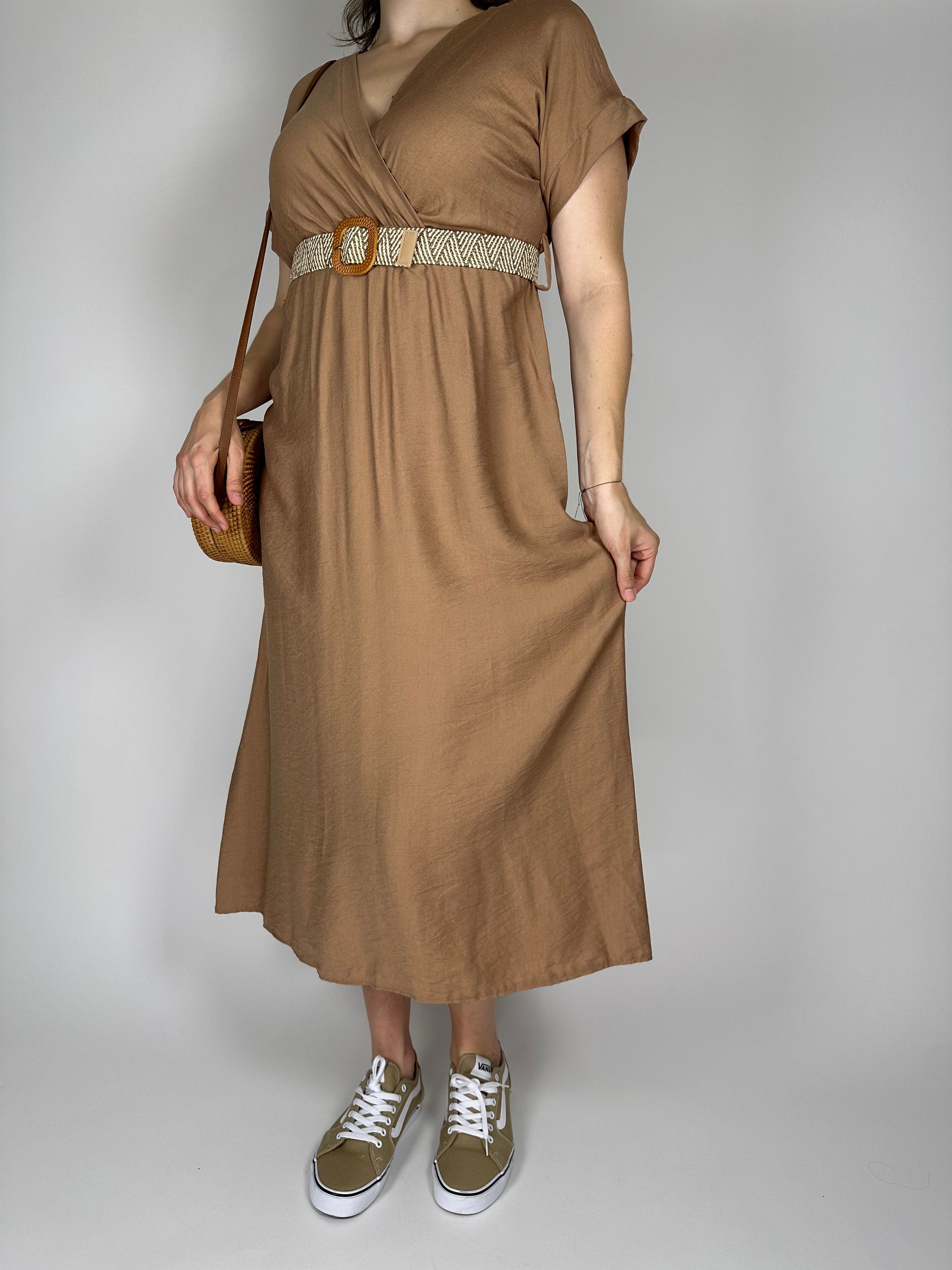 Дълга лятна рокля от висококачествена вискоза с колан и ластик под бюста – едноцветна