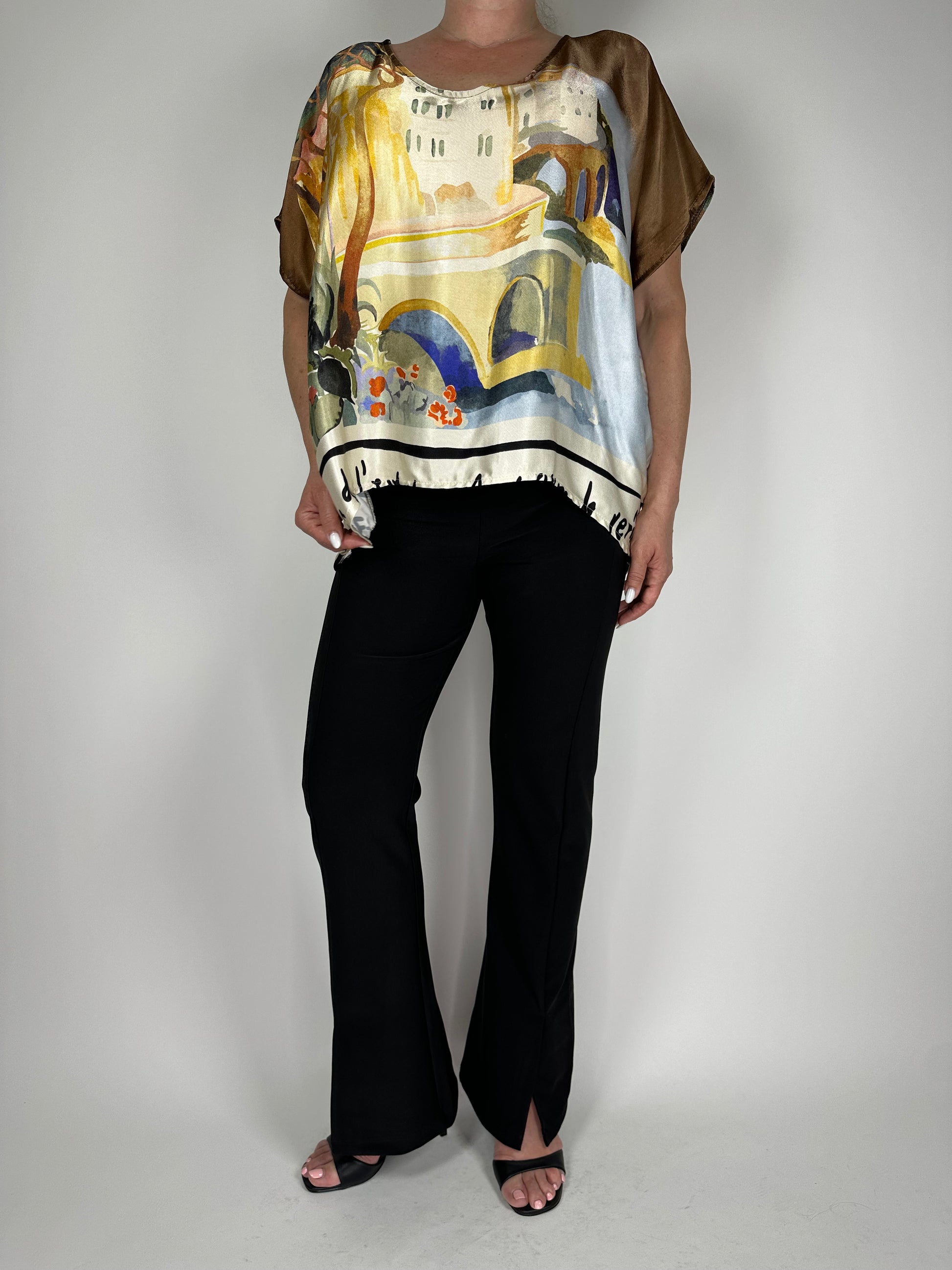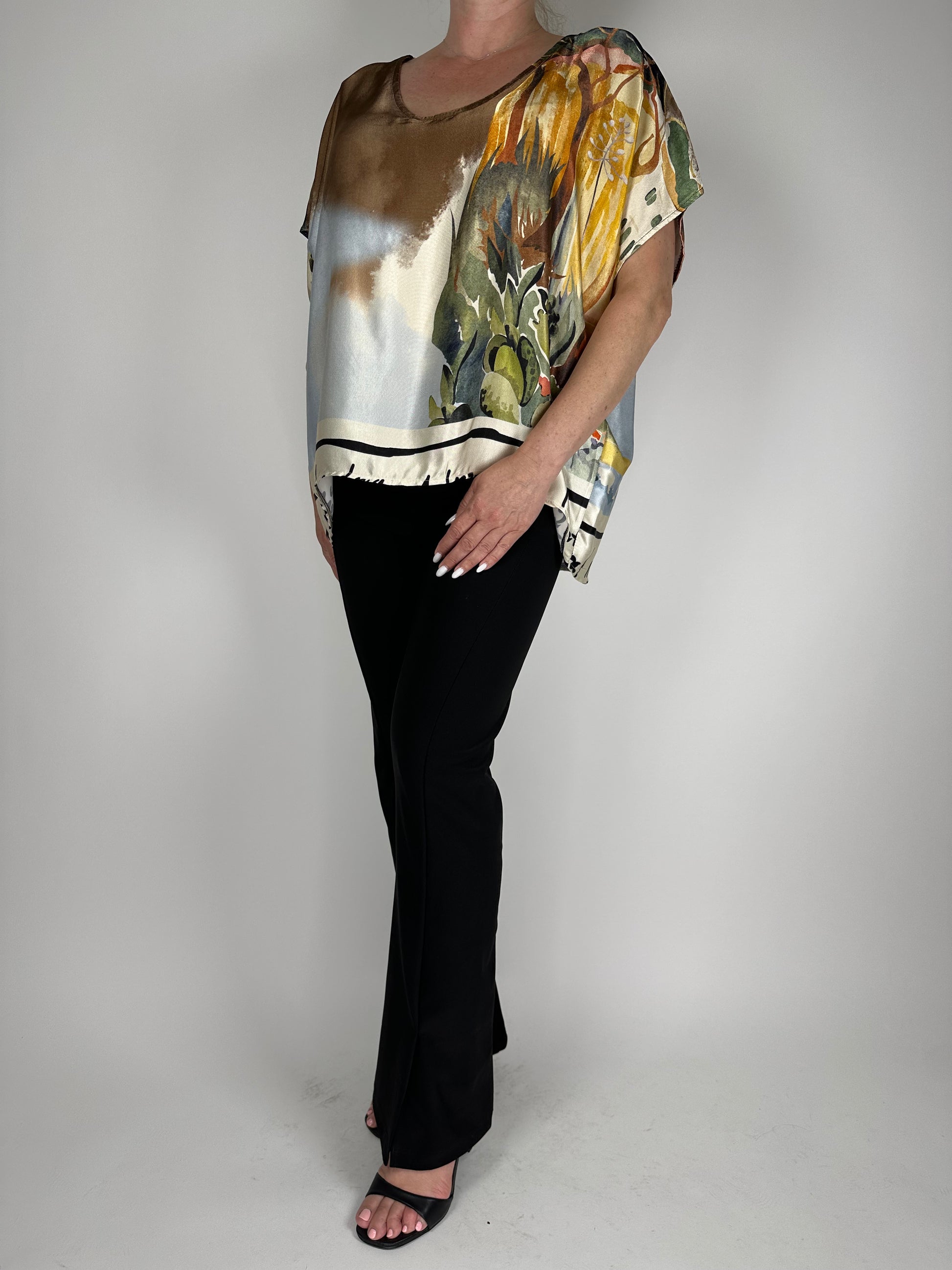 Дамска блуза с паднал къс ръкав, изработена от висококачествена смес от вискоза и коприна. Лека, ефирна и изключително приятна на допир. Цветният принт добавя свежест и стил, идеален избор за летния сезон.