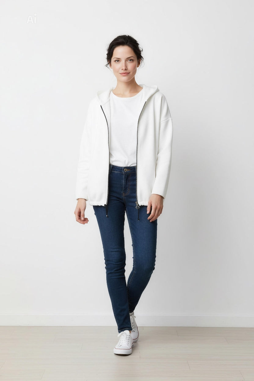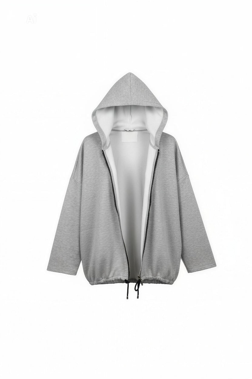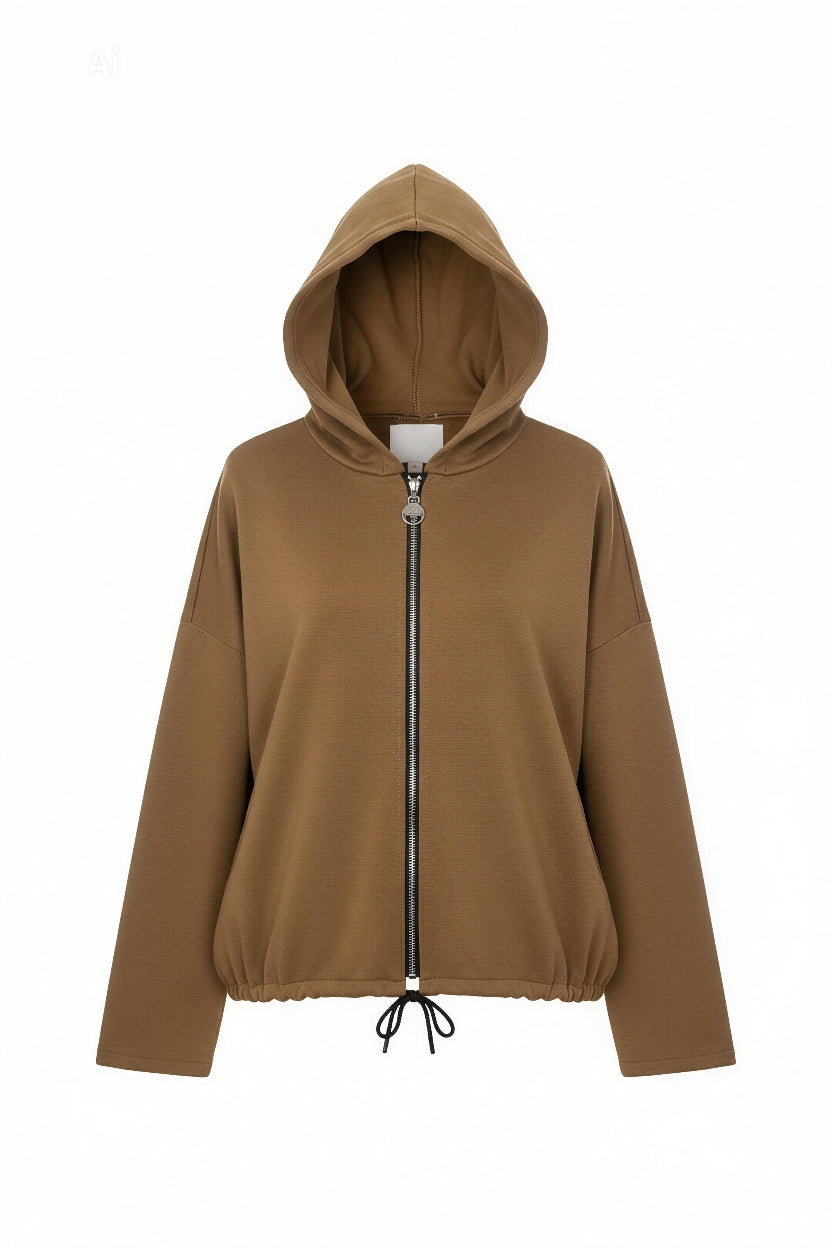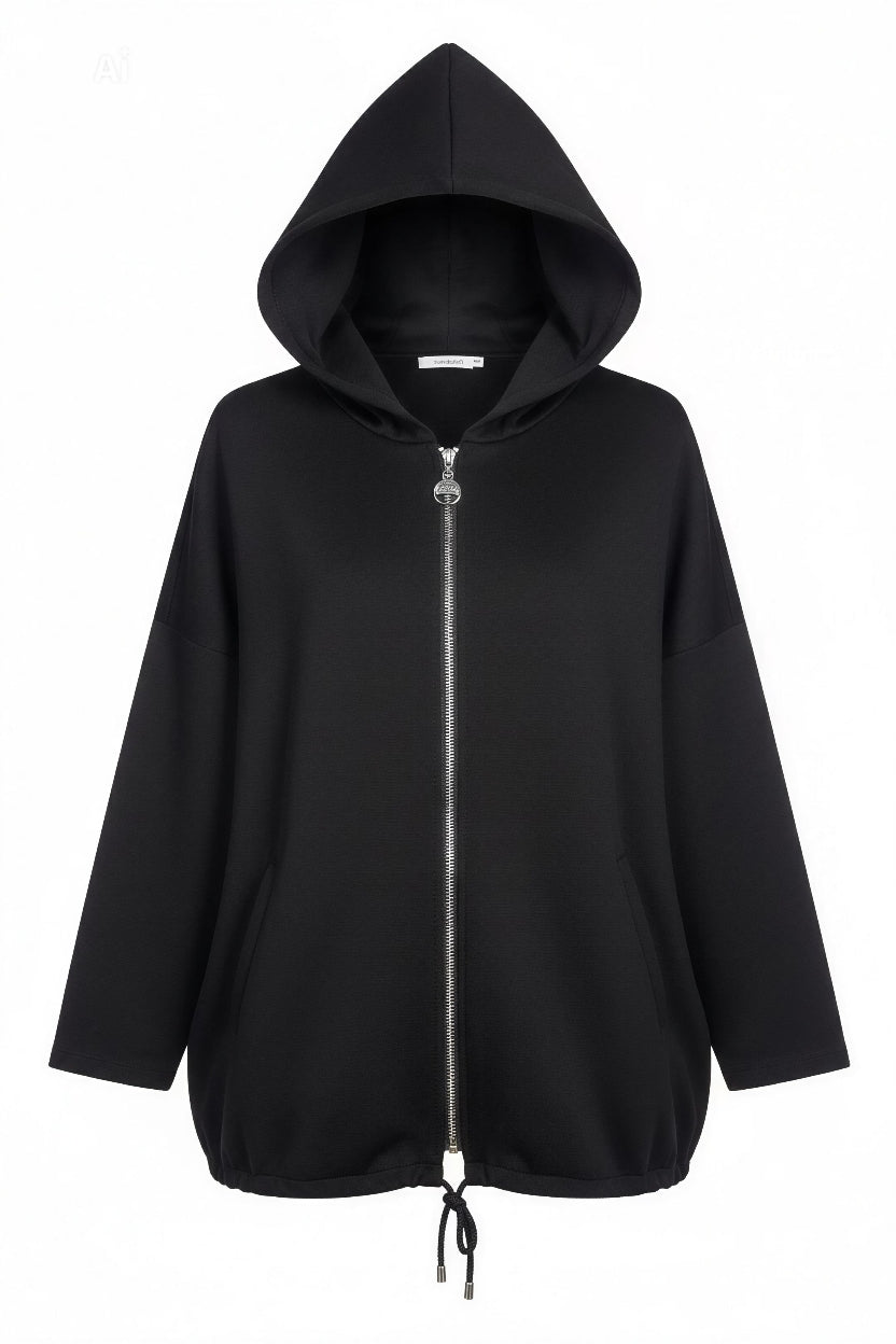 Дамски тренч с модерна спортно-елегантна визия. Моделът е с качулка, цип по цялата дължина и регулируем подгъв с връзки, който оформя силуета. Изработен от мека и комфортна материя – идеален за ежедневието и стилни градски визии.