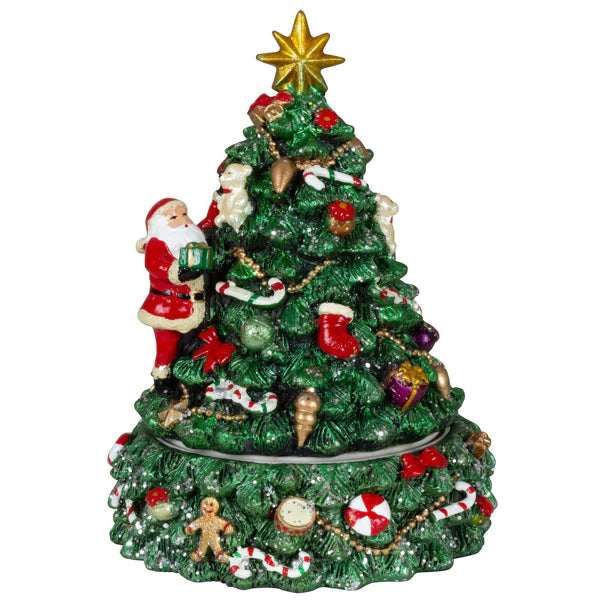 Декоративна коледна елха с плавно въртене и вграден музикален механизъм. Създава уютна и вълшебна атмосфера, идеална за коледна украса в дома или офиса, както и за подарък.
