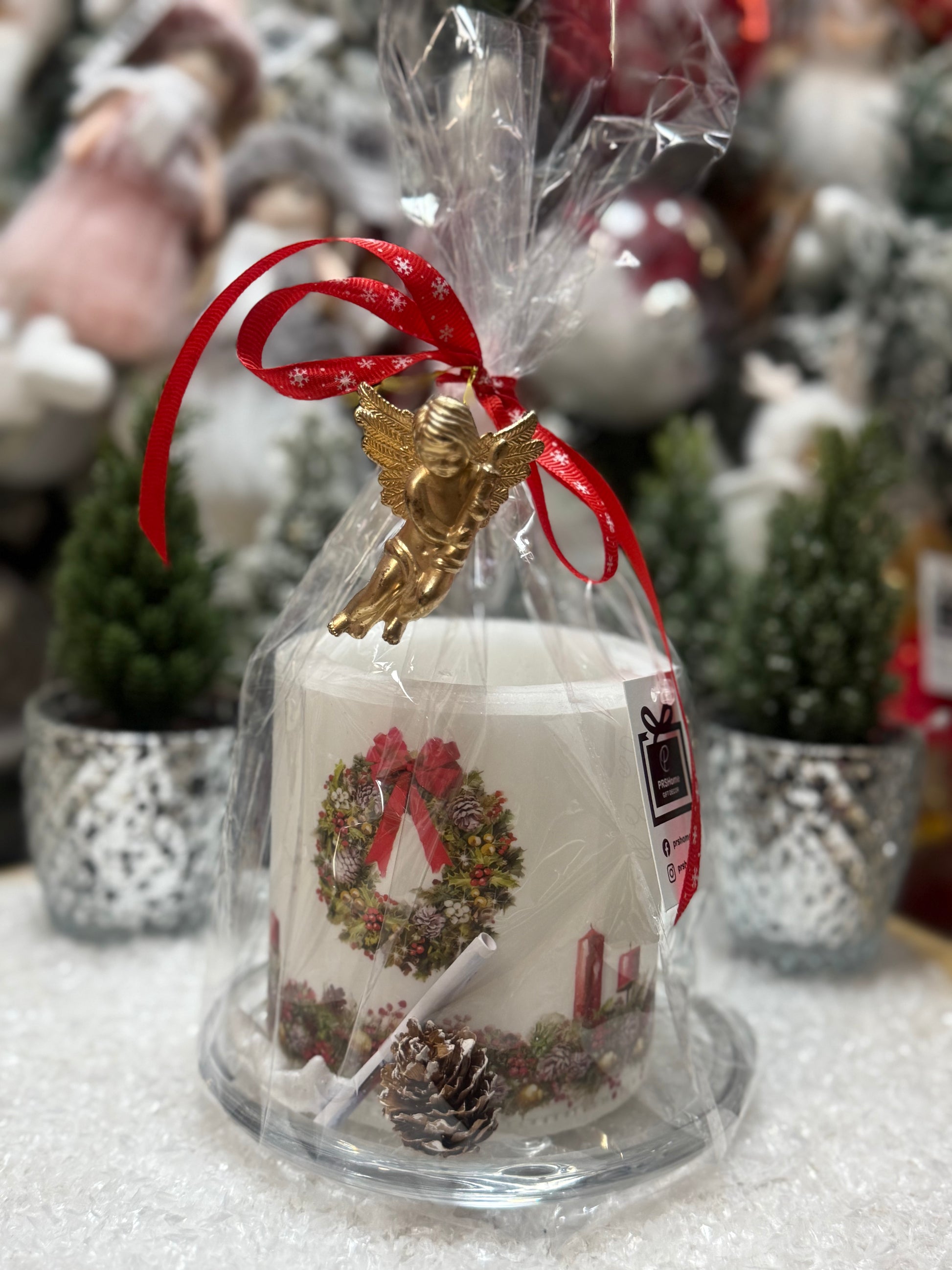 Елегантна декоративна свещ с празнична коледна украса, поднесена върху стилна чинийка-свещник. Комплектът е красиво опакован, готов за подаряване и създаване на уютна, топла атмосфера у дома. Идеален избор за празничен жест или допълнение към коледната декорация.