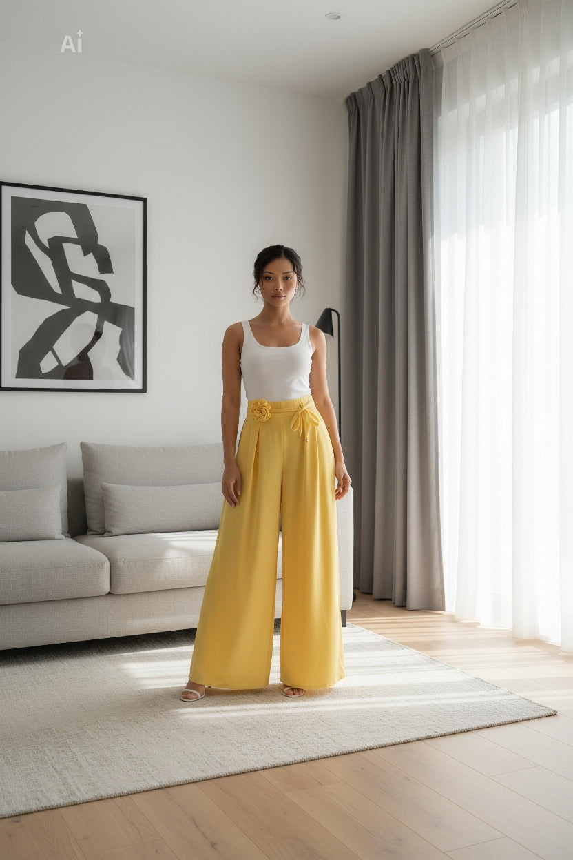 Елегантен пола-панталон с много широки, прави крачоли и свободно падаща линия, която създава ефирно движение при всяка крачка. Високата талия подчертава силуета, а декоративният акцент придава женствен и модерен завършек. Идеален избор за стилни ежедневни визии и изискана градска елегантност.