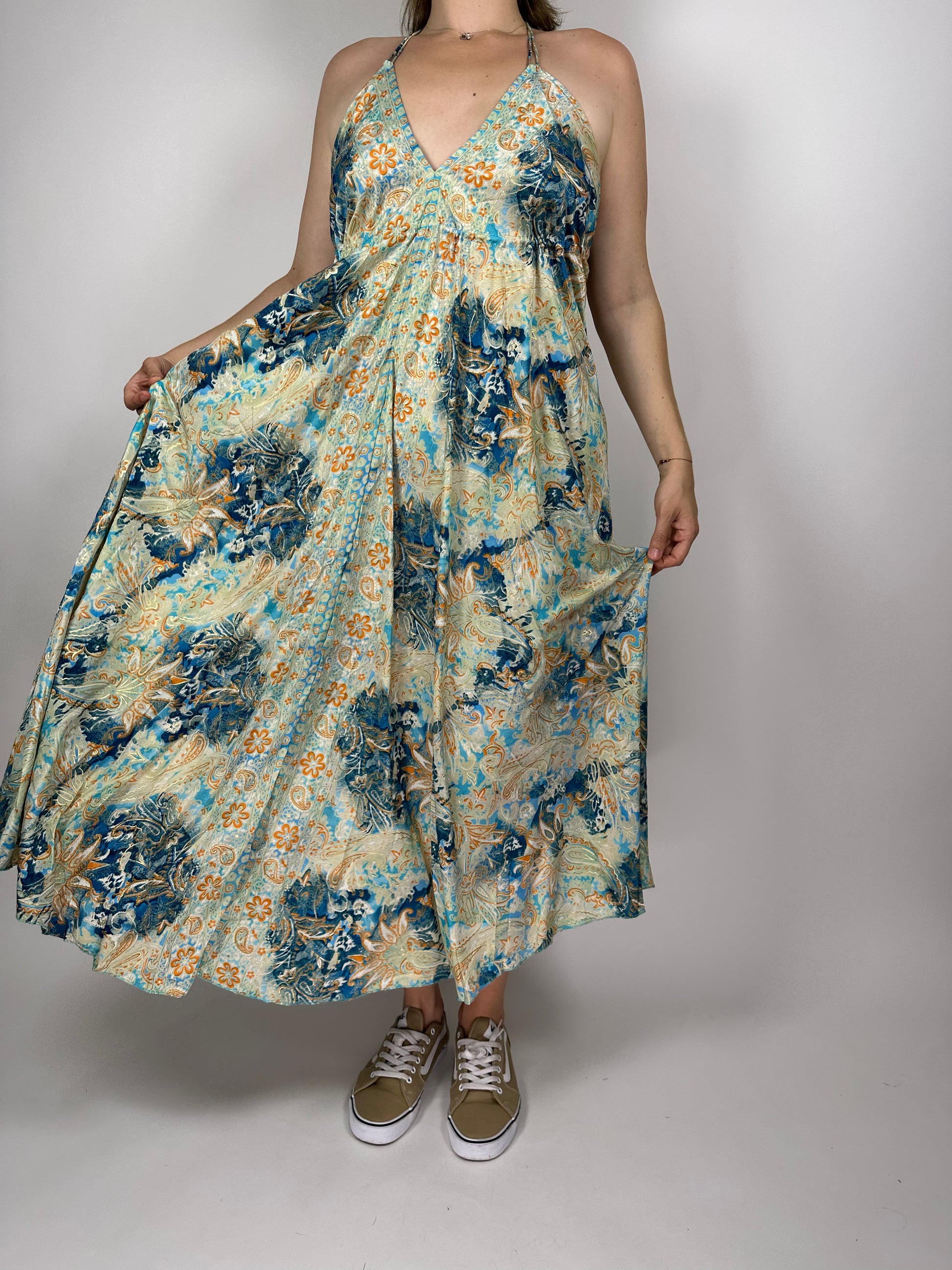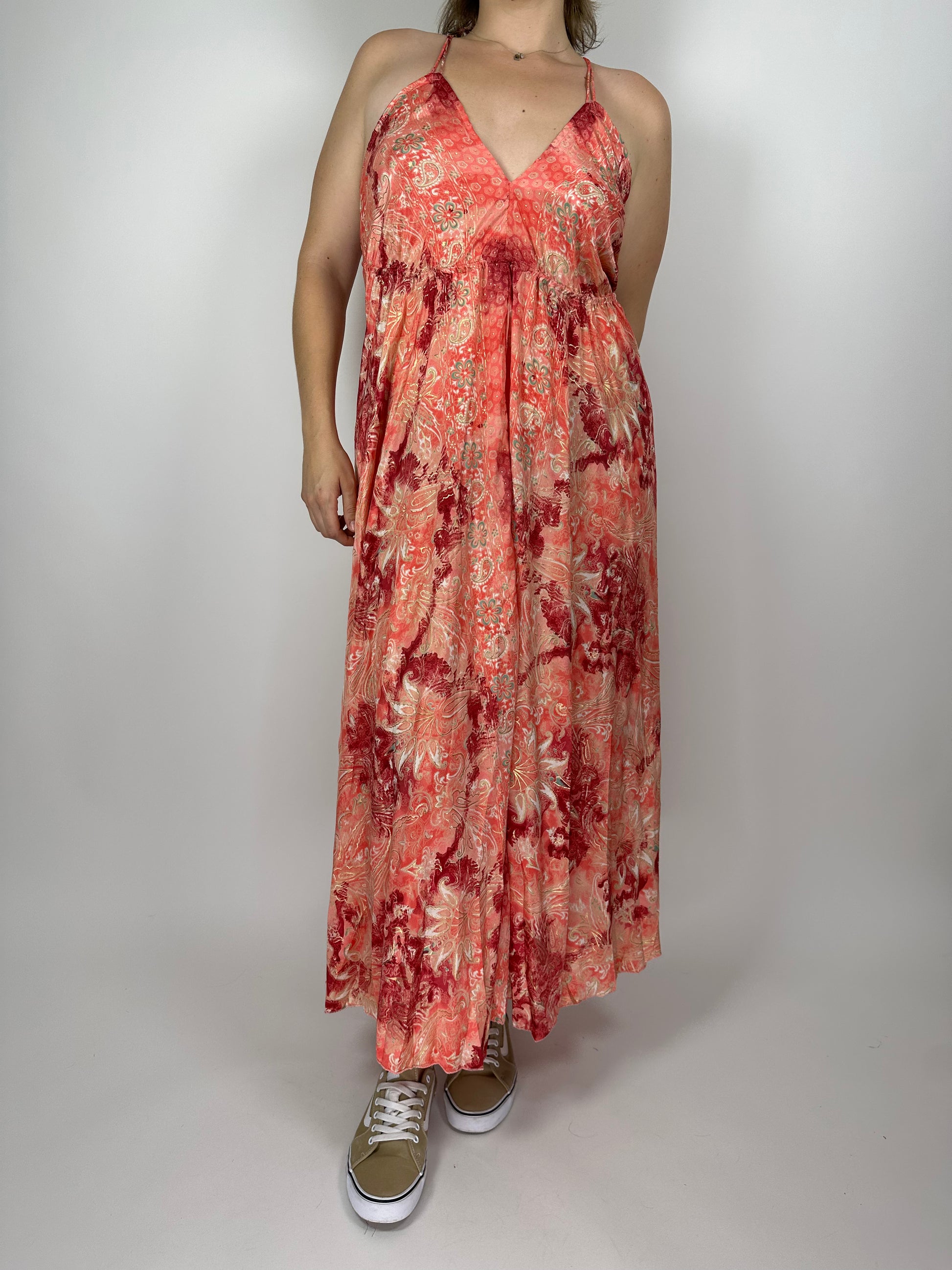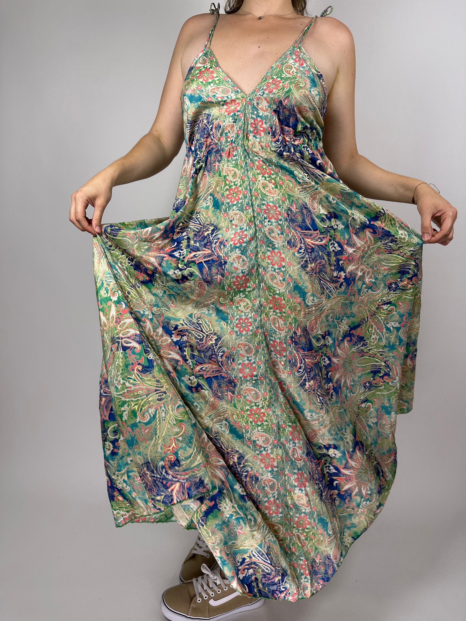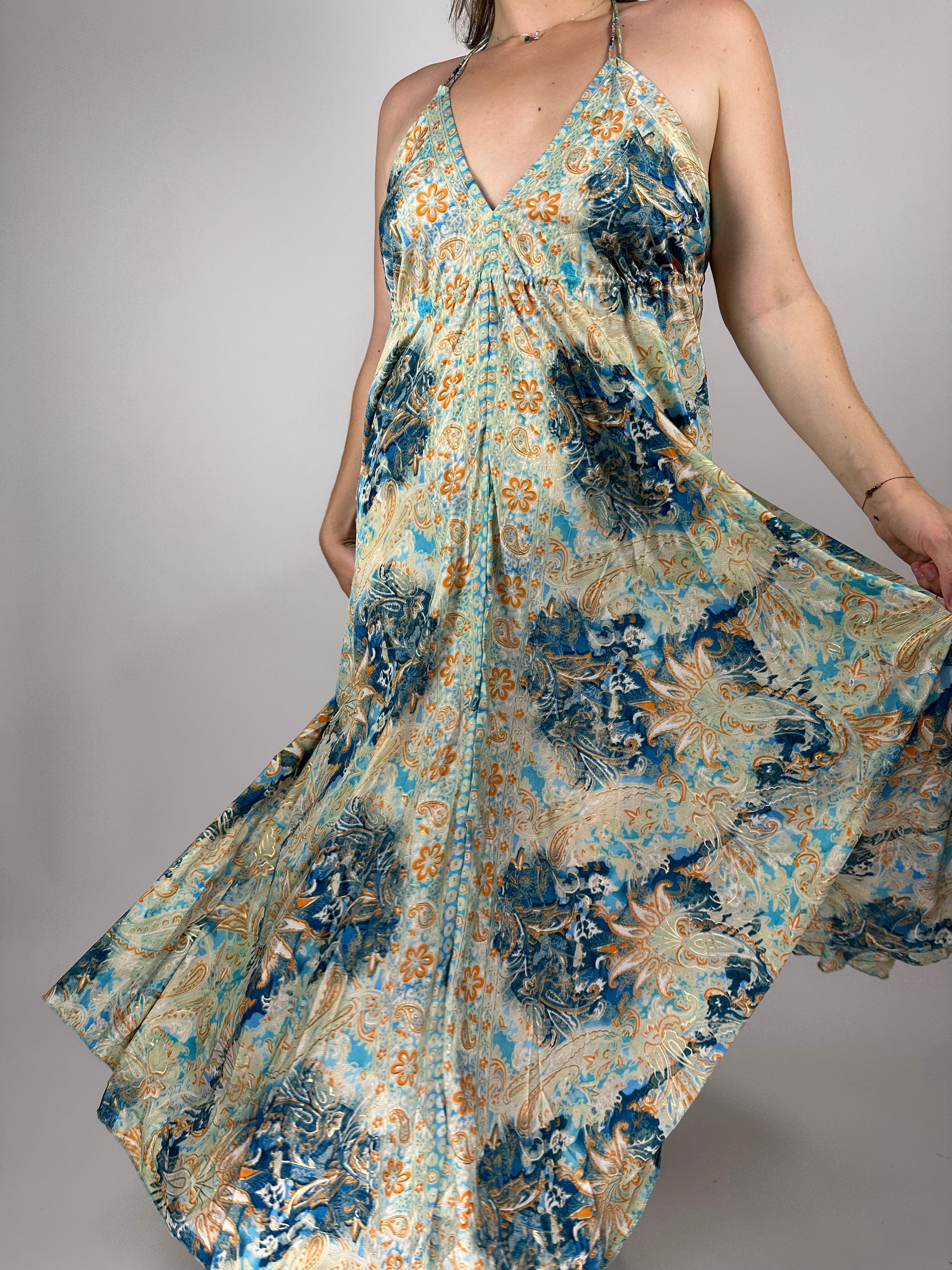 Индийска дълга рокля с ефирна, свободна кройка и регулируеми презрамки, изработена от фина поли-коприна с флорални десени. Моделът е с V-образно деколте и връзка под бюста за подчертаване на талията. Леката, нежно блестяща материя осигурява комфорт и елегантност през целия ден. Перфектна за летни дни, ваканции и бохо стил визии.