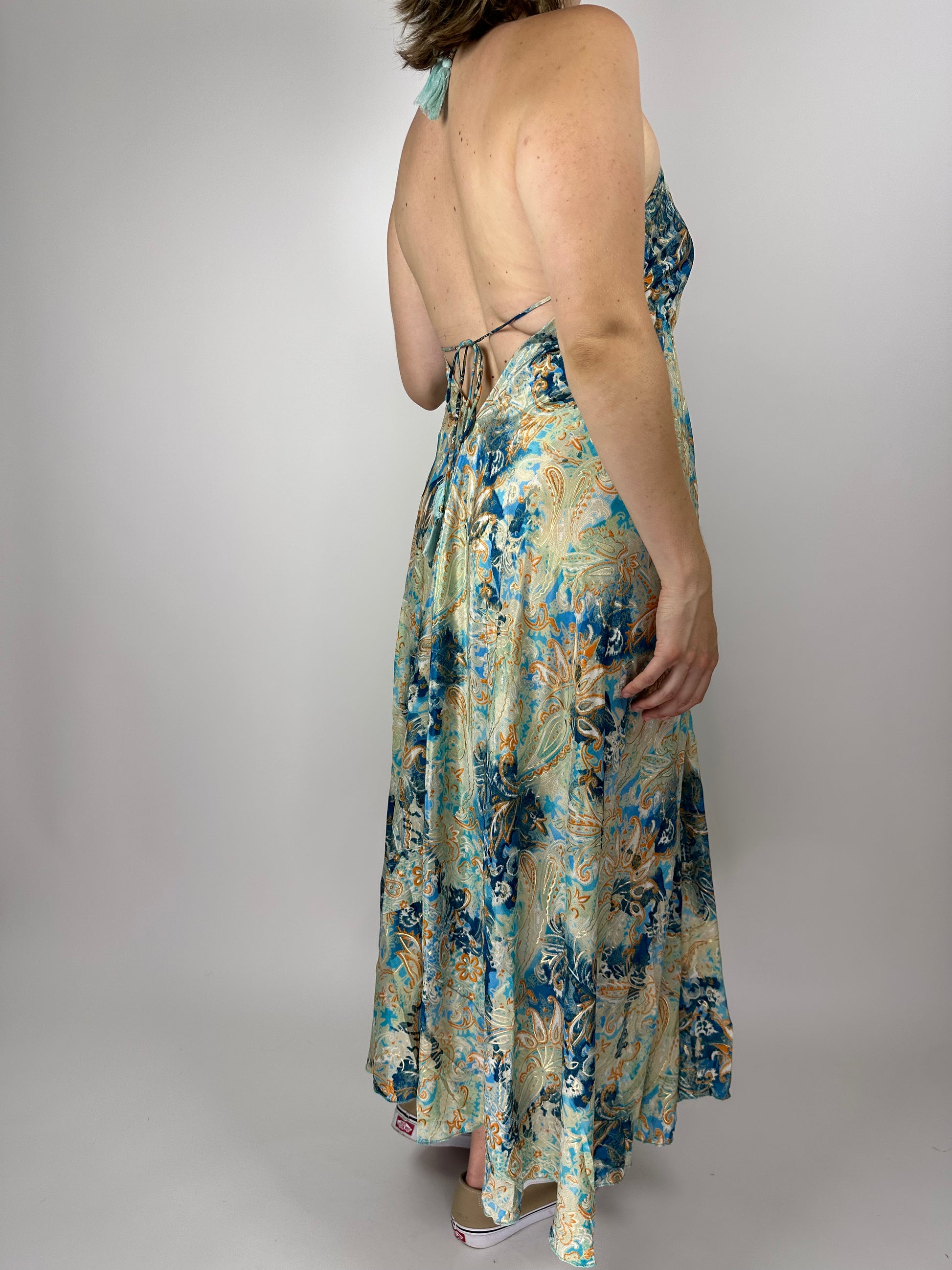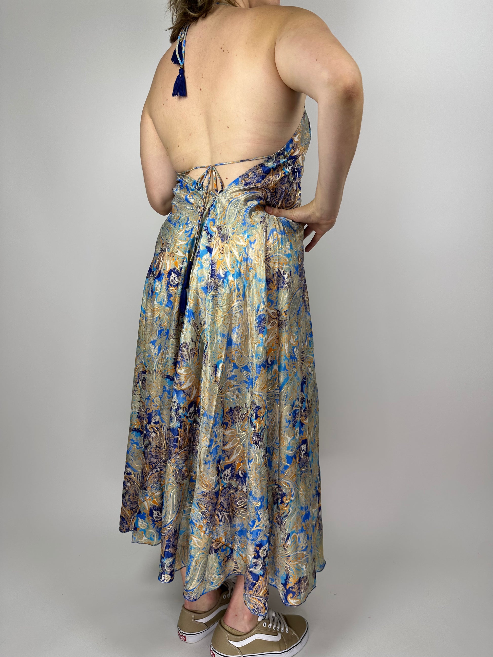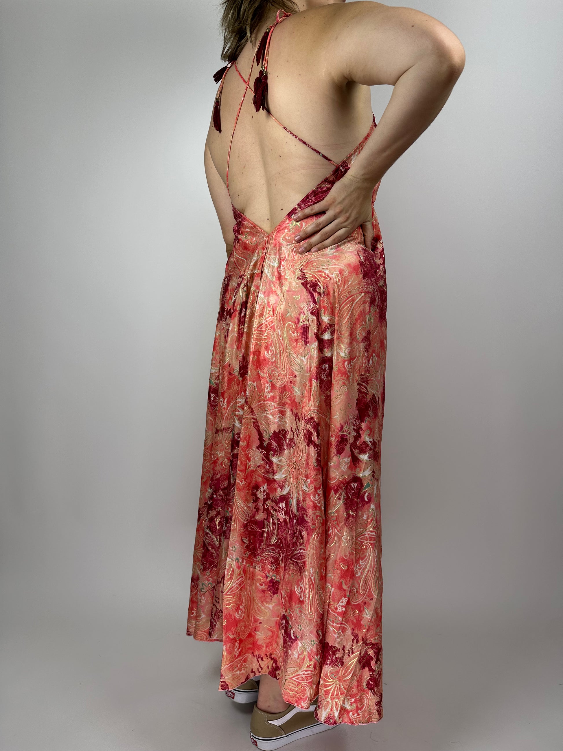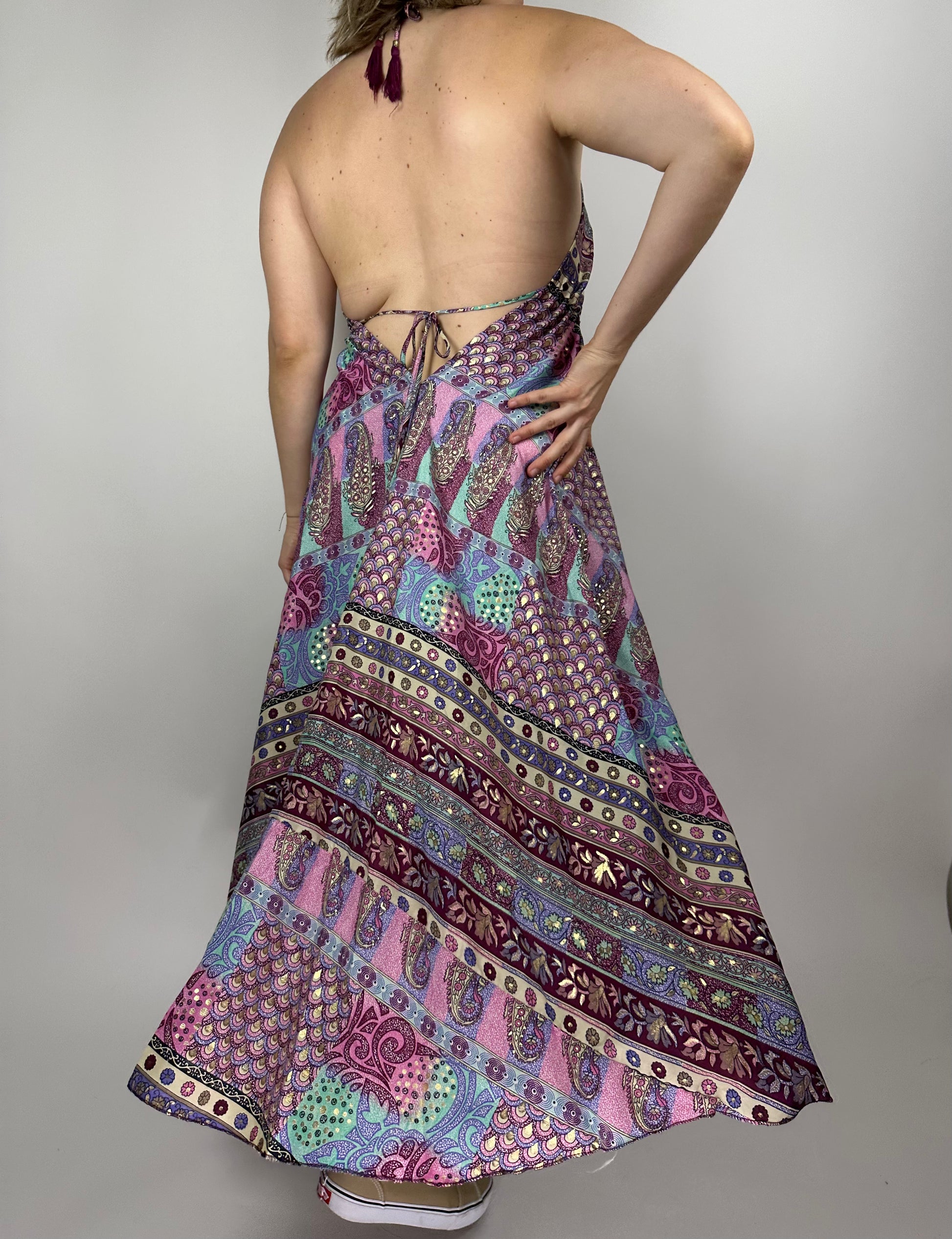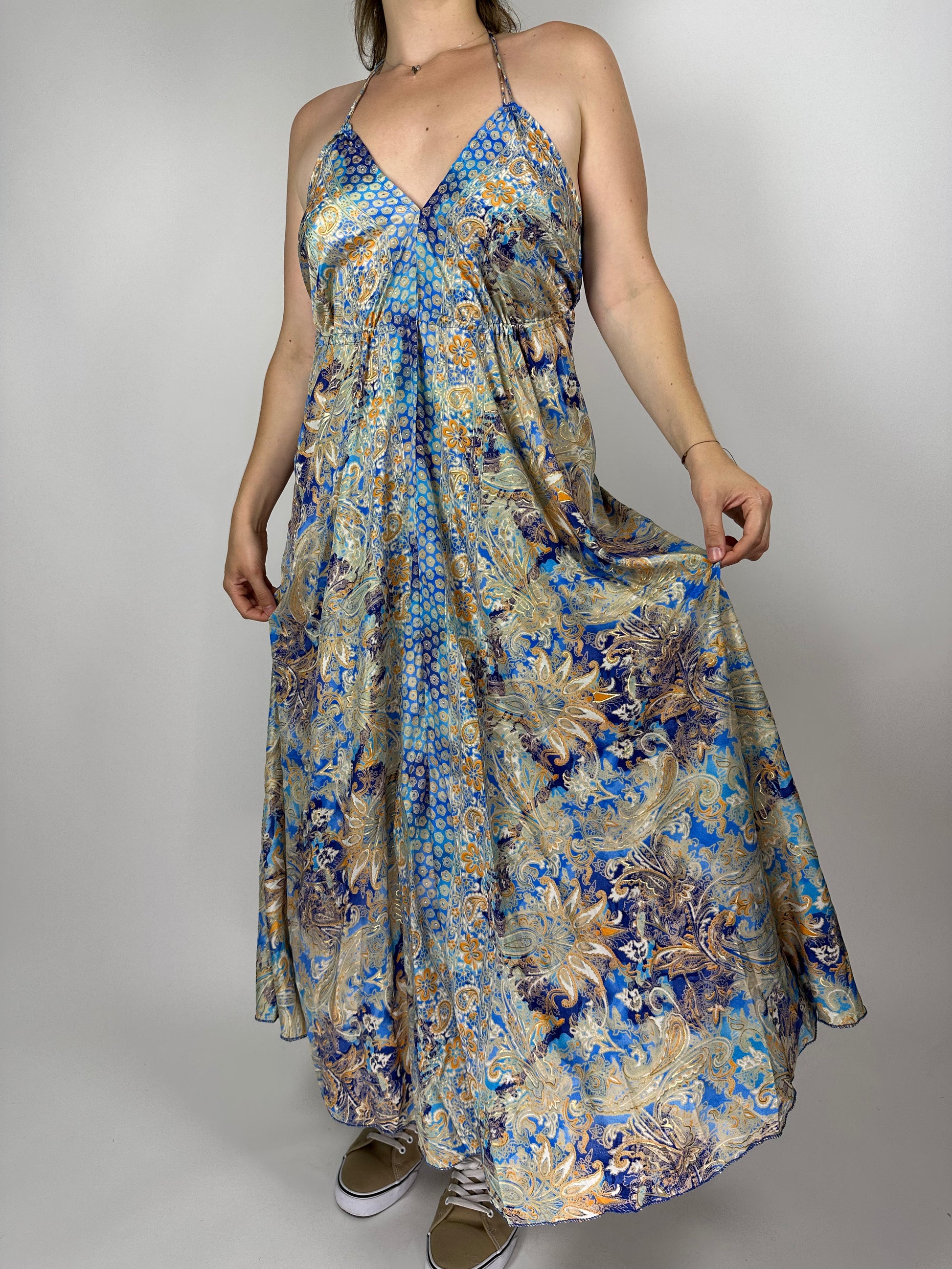 Индийска дълга рокля с ефирна, свободна кройка и регулируеми презрамки, изработена от фина поли-коприна с флорални десени. Моделът е с V-образно деколте и връзка под бюста за подчертаване на талията. Леката, нежно блестяща материя осигурява комфорт и елегантност през целия ден. Перфектна за летни дни, ваканции и бохо стил визии.