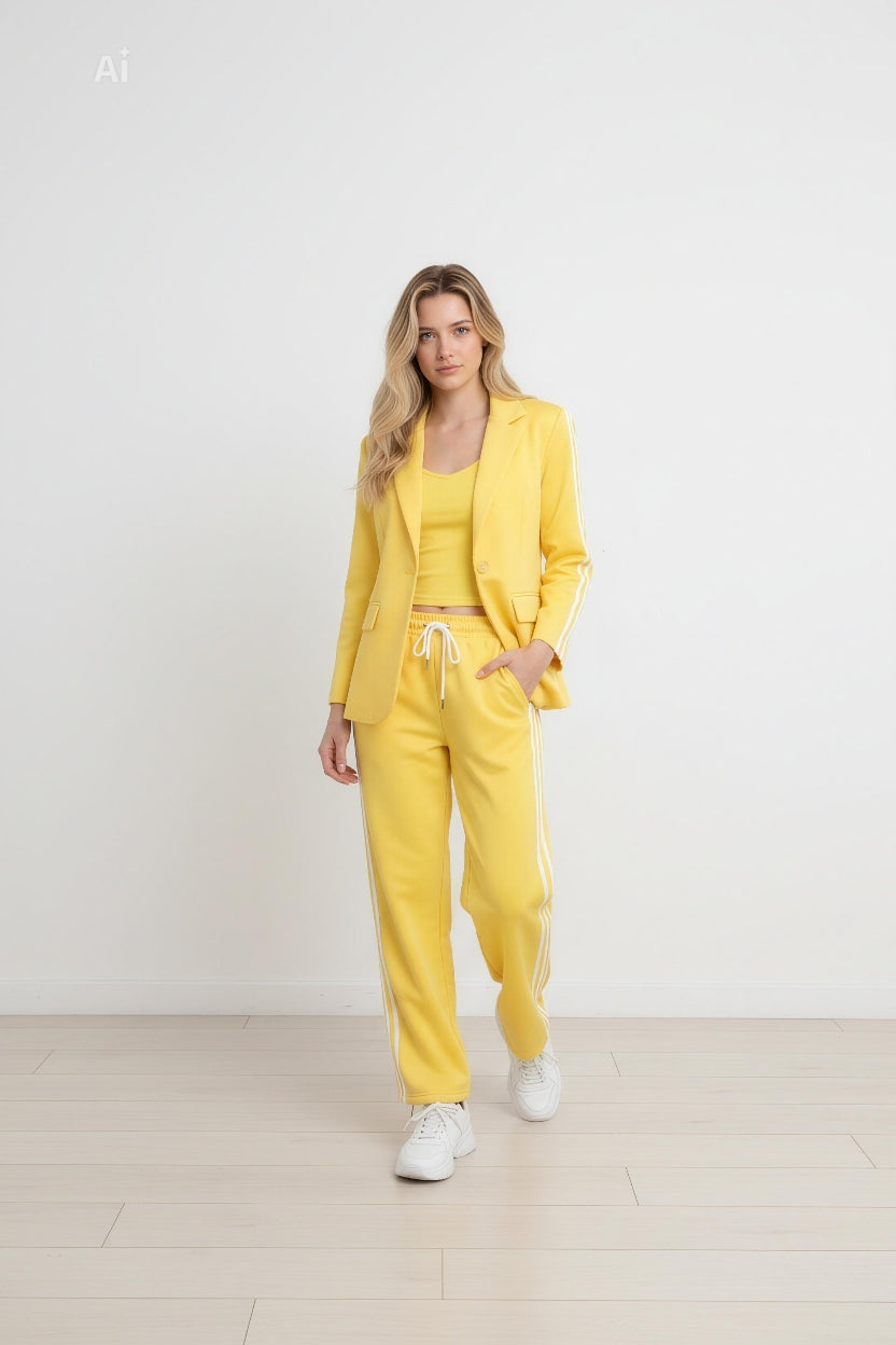Изискан комплект от сако и панталон, съчетаващ елегантност и модерен спортен акцент. Вталеното сако с едно копче и дължина до ханша оформя изчистен и женствен силует. Панталонът е със свободна линия с еластична талия и връзка за безупречен комфорт. Фините спортни ленти по ръкавите и крачолите добавят съвременен и стилен завършек.