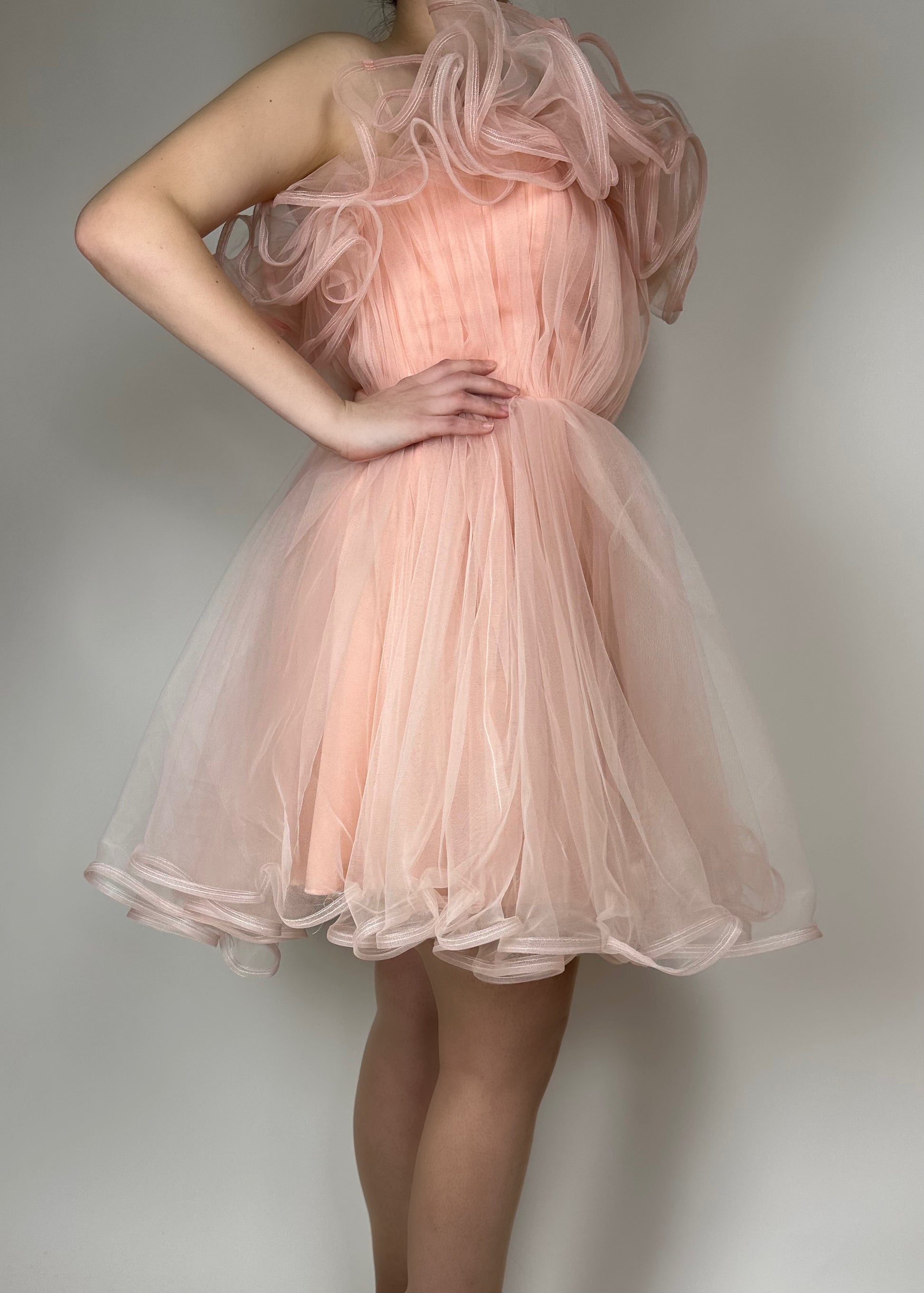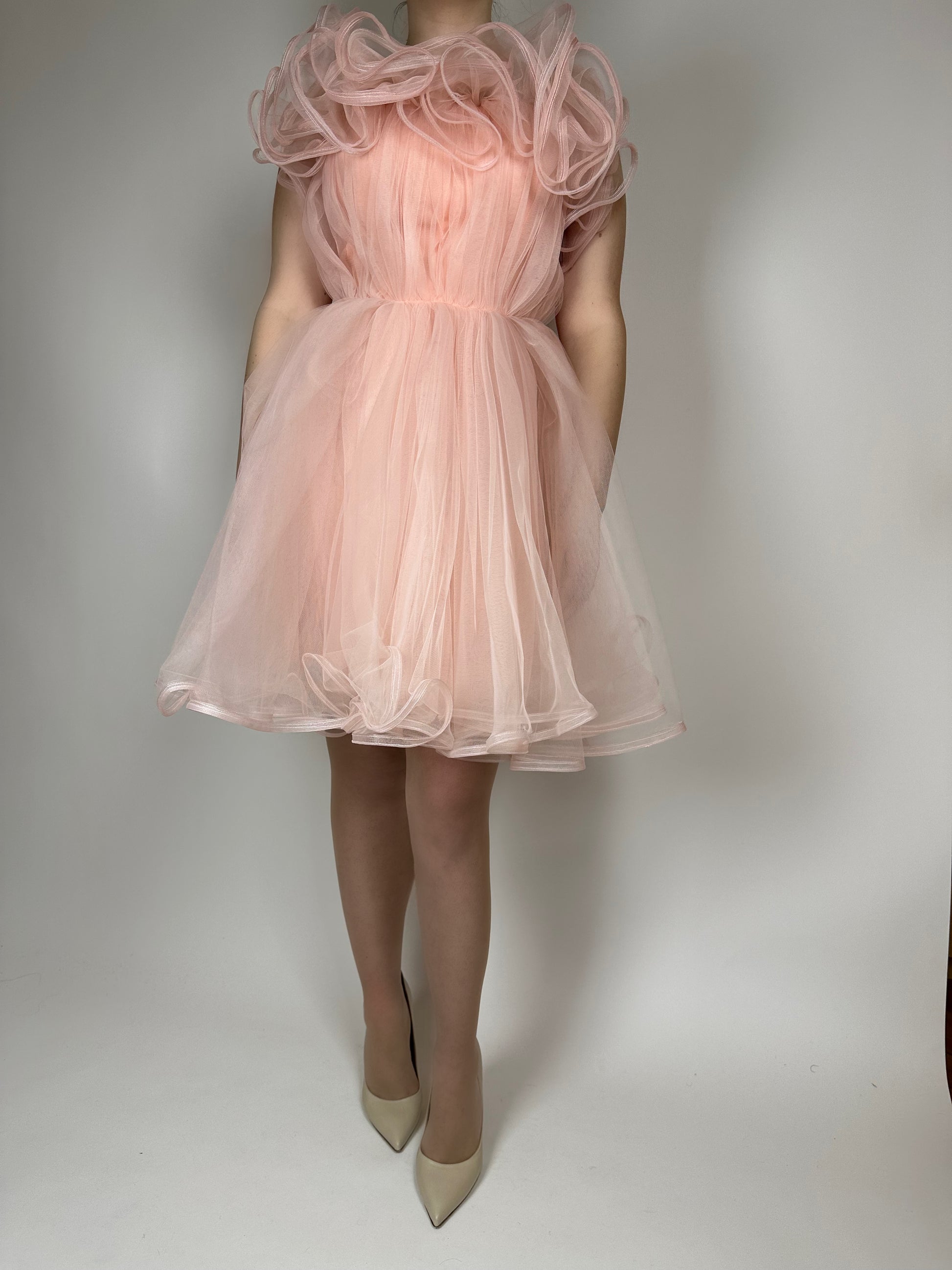 Къса рокля без ръкави, изработена от ефирен шифон