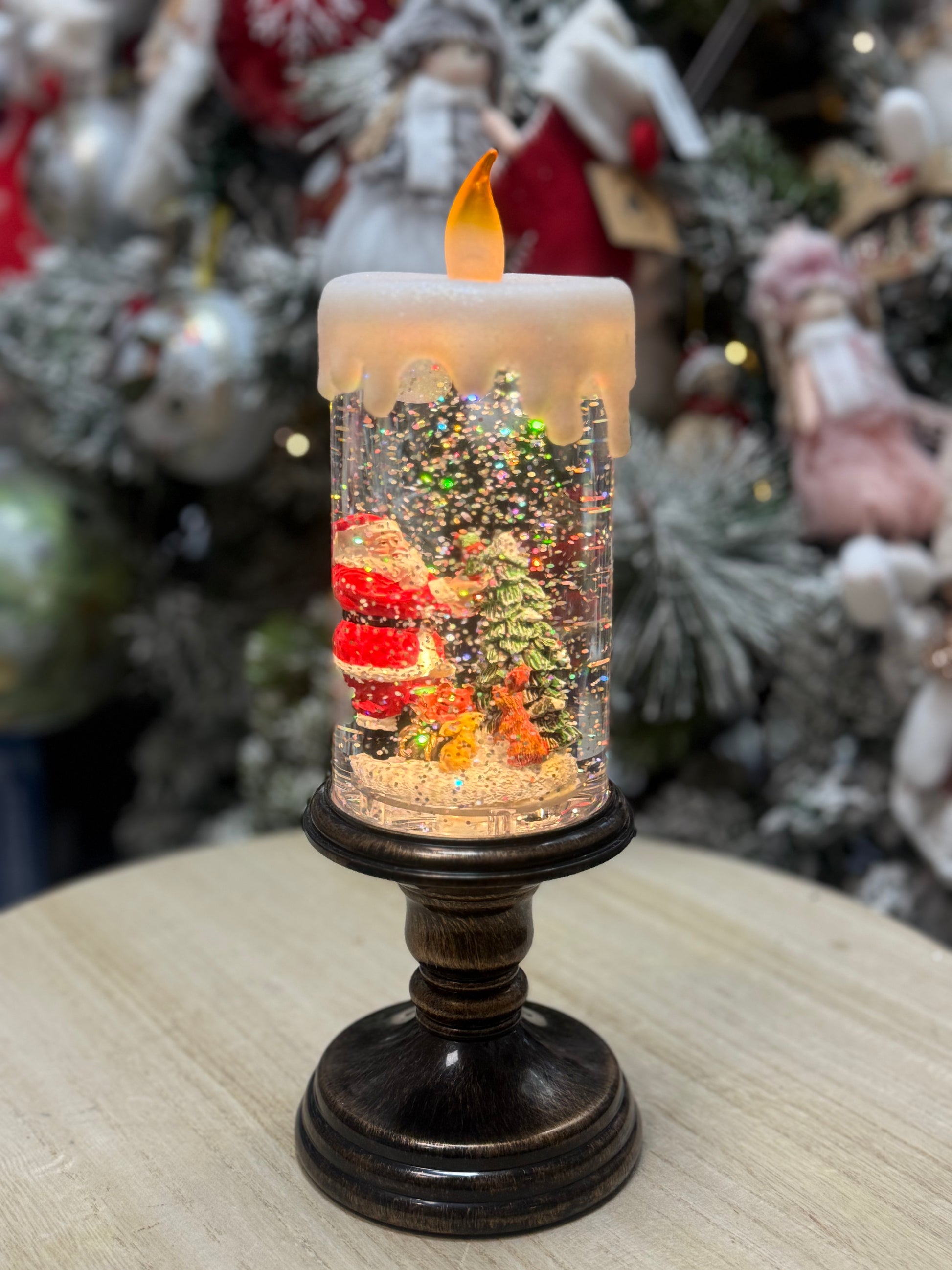 Елегантна коледна свещ с блестящ глитер ефект и LED светлина. Работи на батерии, което позволява лесно поставяне навсякъде в дома. Създава топла и празнична атмосфера – идеална за коледна украса или подарък.