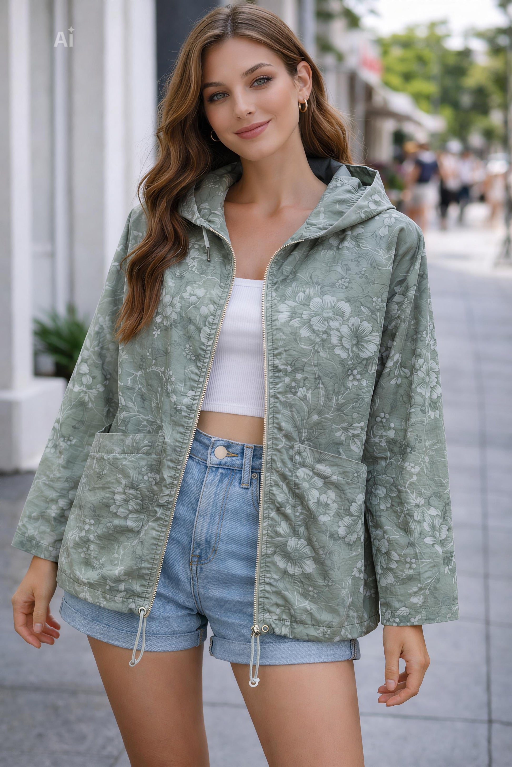 Леко и стилно яке със свободна кройка и нежен флорален принт, създадено за комфорт и модерна визия. Моделът разполага с цип, качулка, два практични предни джоба и връзка в долната част за регулиране. Перфектният избор за пролетно-летния сезон – удобство, лекота и свеж стил в едно.