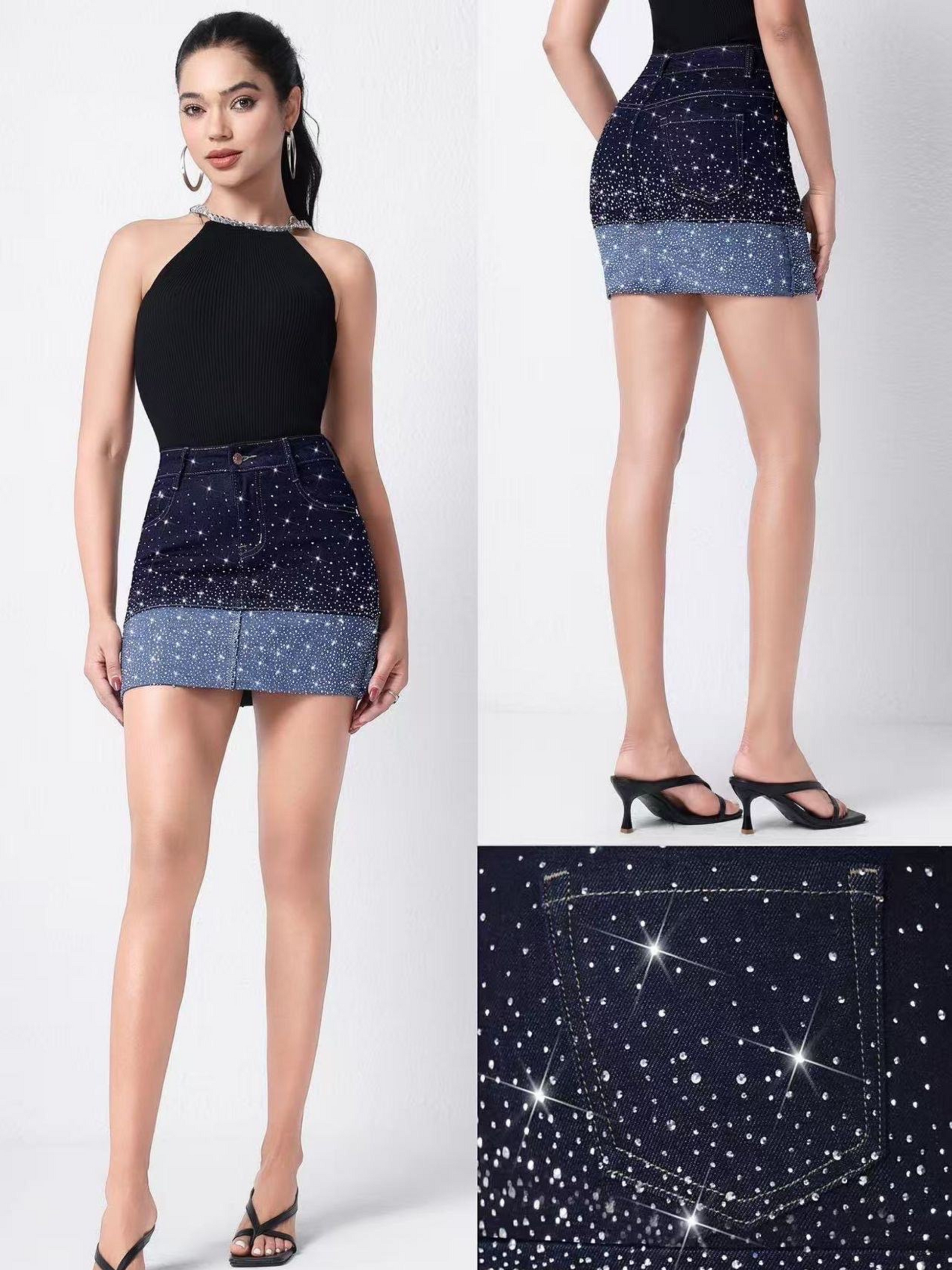 Елегантна къса пола, украсена с фини камъни за блестящ акцент. Идеална за парти визии или стилни ежедневни комбинации. Подчертава силуета и добавя доза блясък към всяка стъпка.