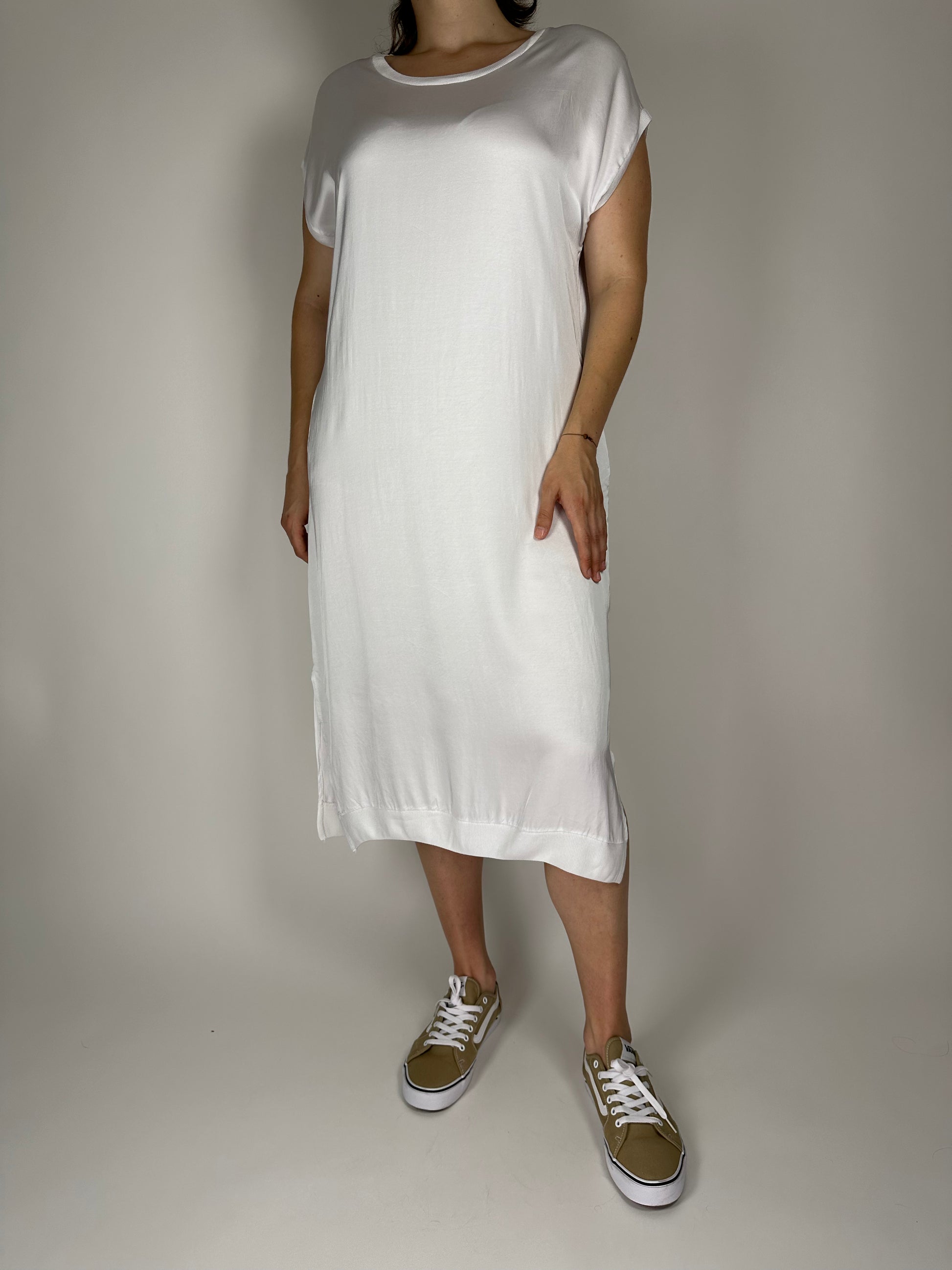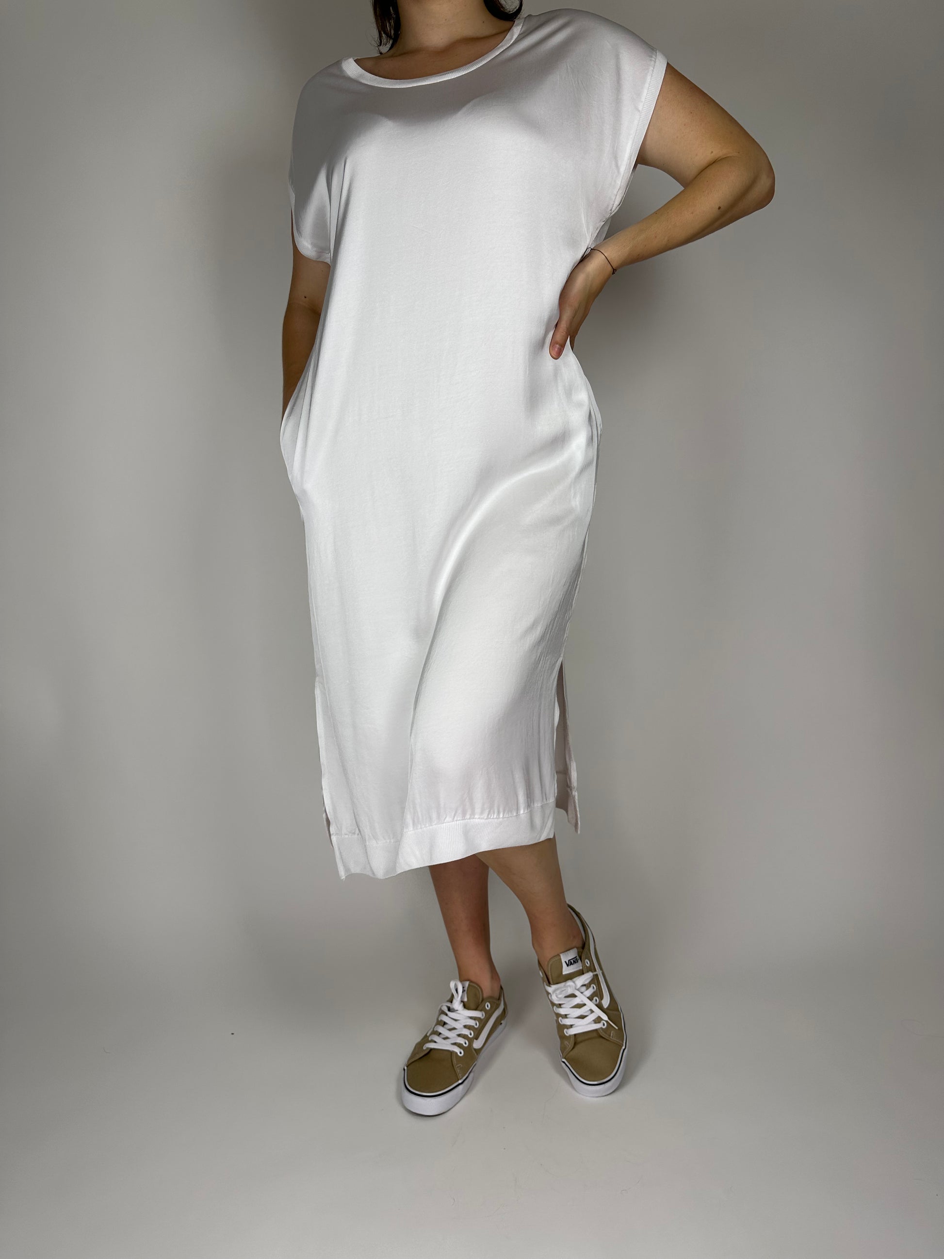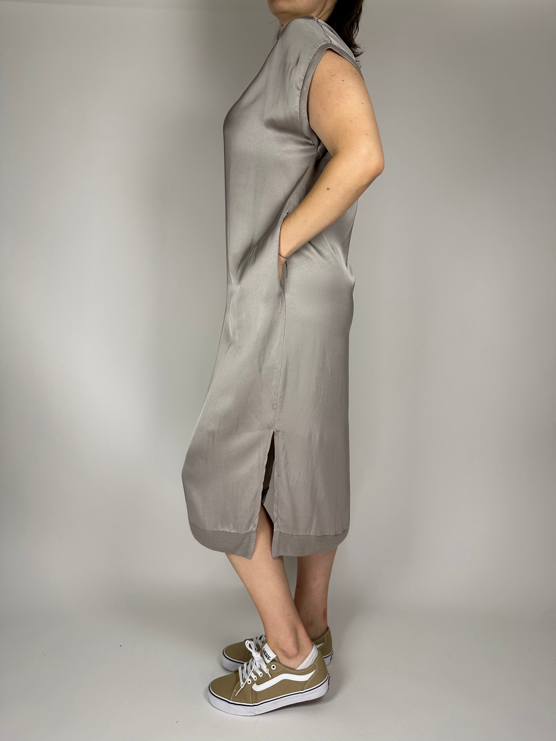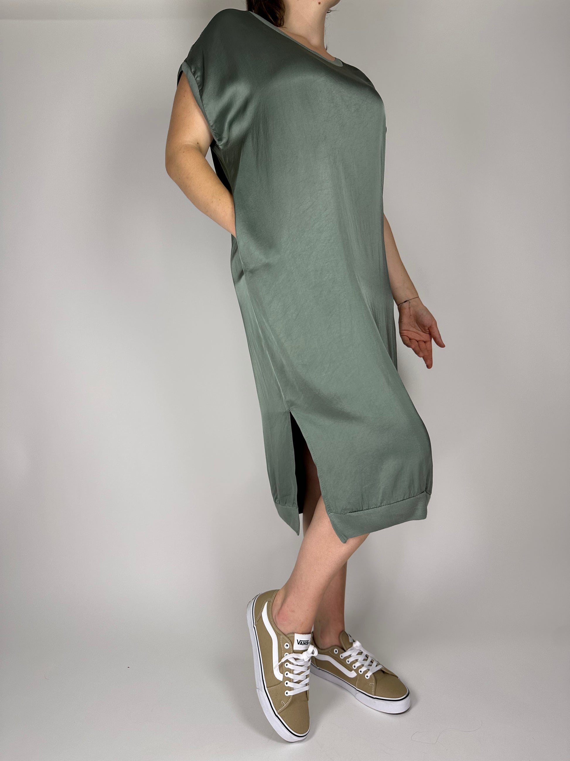 Нашата нова рокля от сатенирана вискоза е създадена да гали кожата и да подчертае женствеността ти. Паднал ръкав за небрежна елегантност. Практични джобове – стил и удобство в едно. Фин сатенен блясък, който улавя светлината.