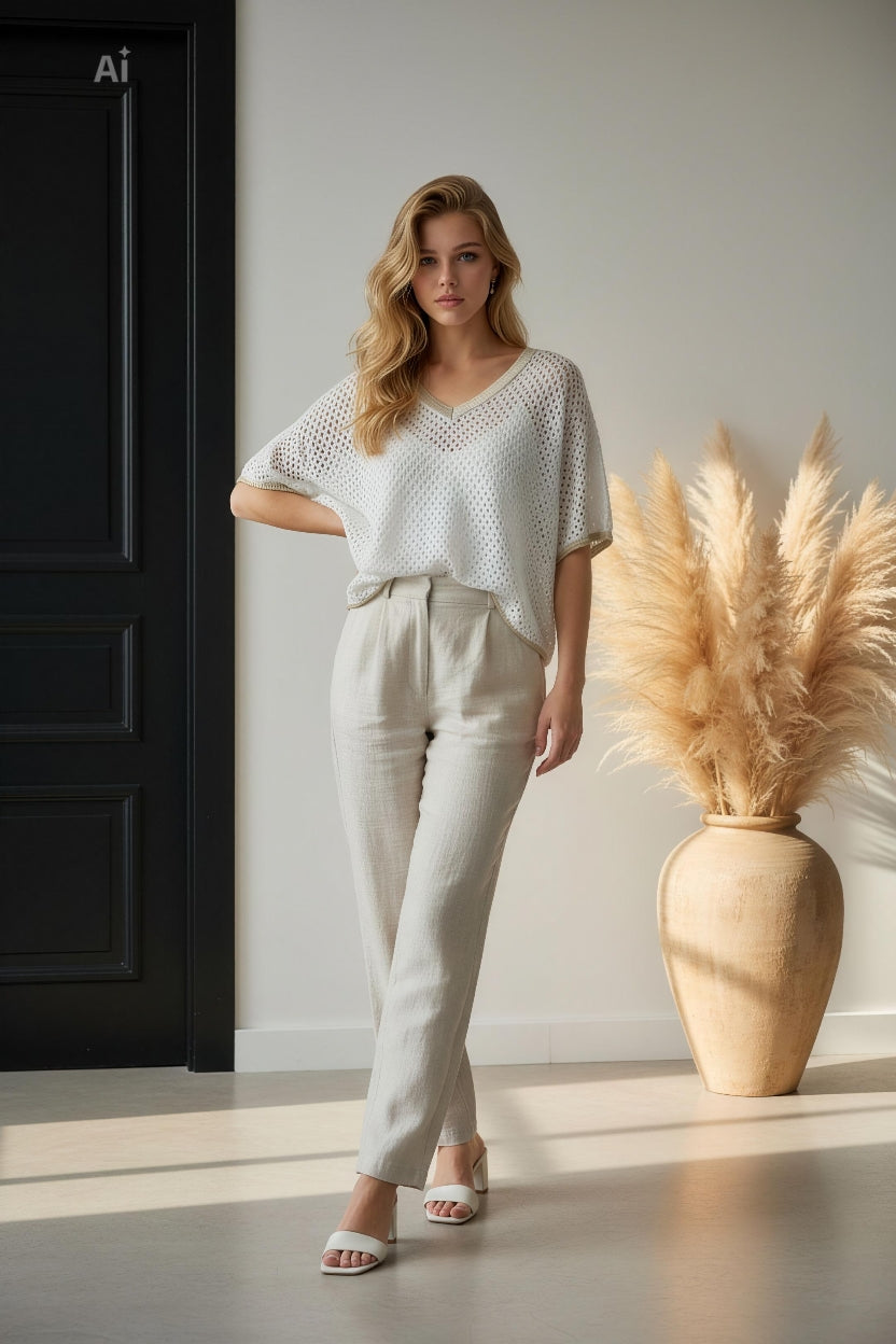 Стилна дамска блуза с ефектна мрежеста текстура и модерно V-образно деколте с контрастен кант. Свободната кройка придава лекота и комфорт, а фините детайли създават елегантна и съвременна визия. Идеален акцент както за ежедневни, така и за по-елегантни комбинации.