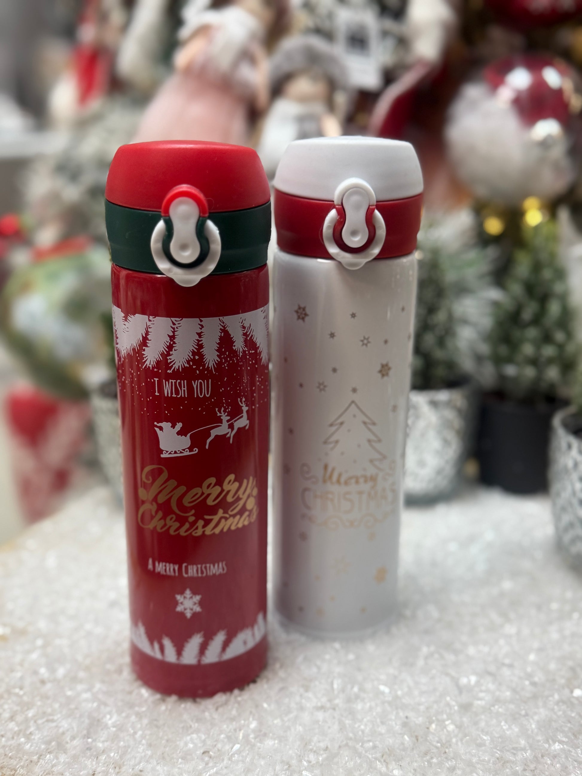 Практичен и стилен термос с празнични коледни мотиви, идеален за топли напитки през зимните дни. Удобен за носене и перфектен като сезонен подарък или допълнение към коледната атмосфера.