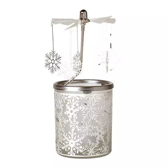 Елегантен свещник от стъкло и метал, който се завърта от топлината на горяща чаена свещ. Декориран е с висящи снежинки и орнаментика в същия мотив. Създава красив, движещ се светлинен ефект и е идеален за празнична украса или като подарък.