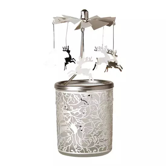 Елегантен свещник от стъкло и метал, който се завърта от топлината на горяща чаена свещ. Декориран е с висящи елени и орнаментика в същия мотив. Създава красив, движещ се светлинен ефект и е идеален за празнична украса или като подарък.