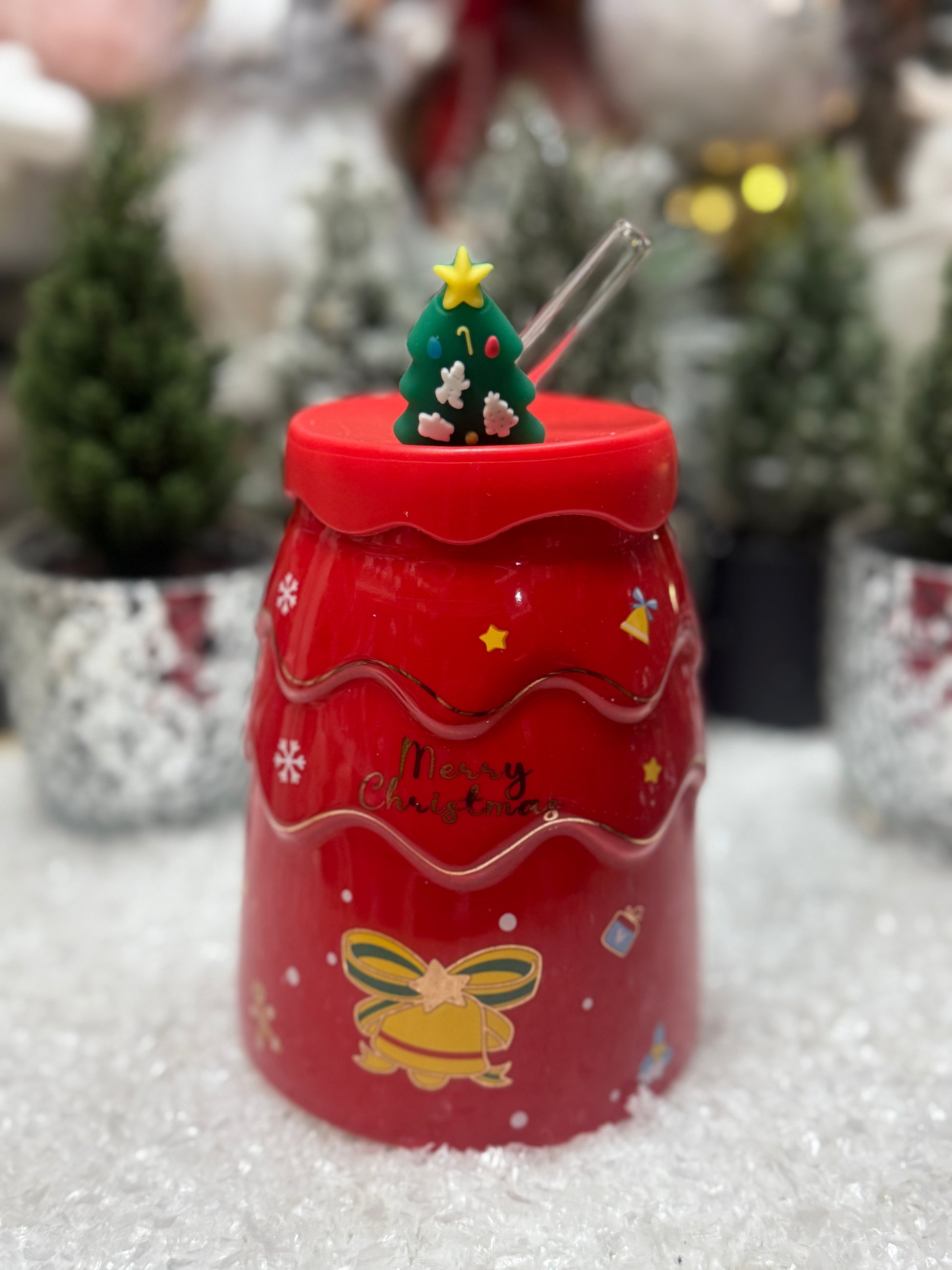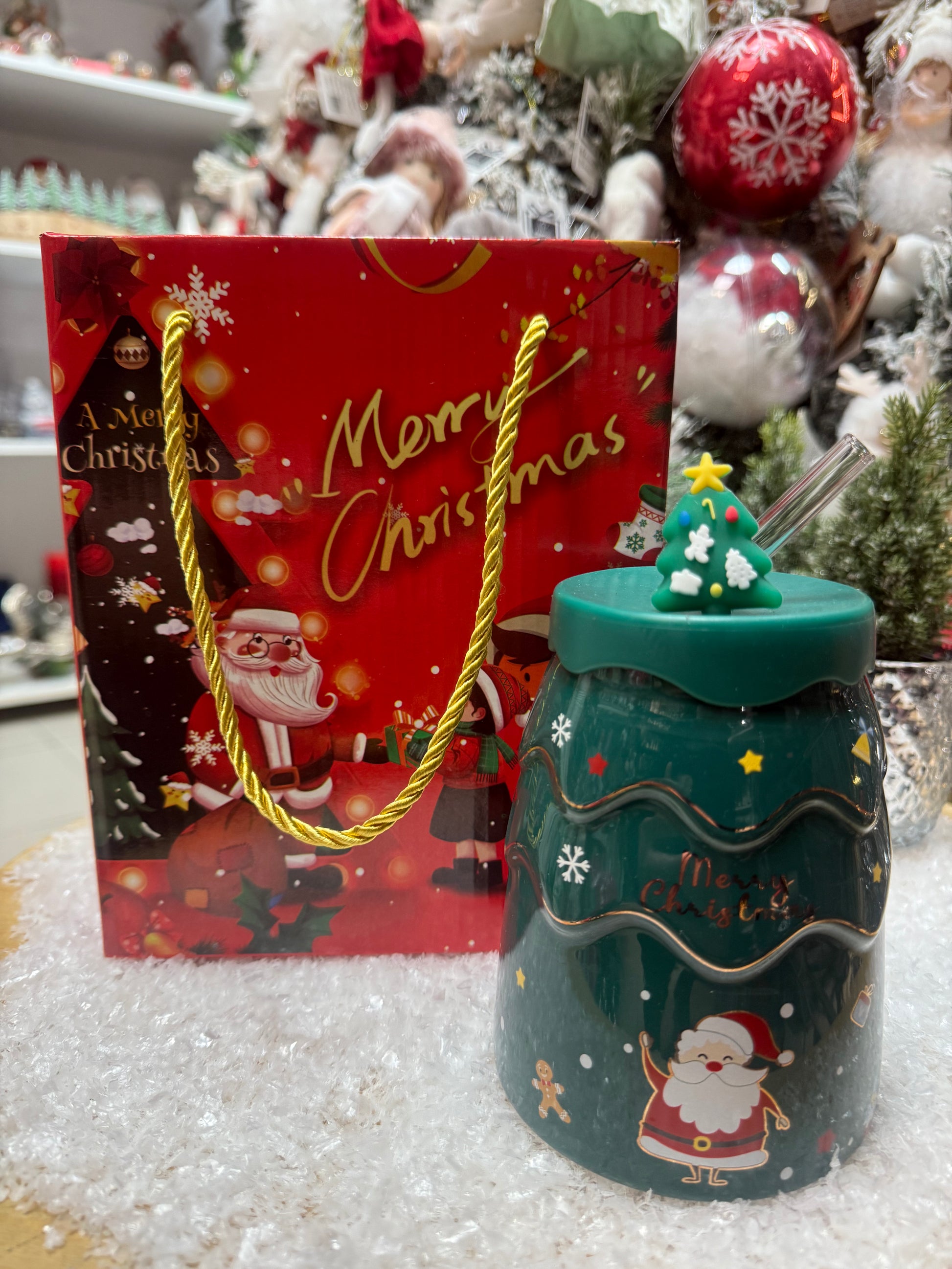 Стилна чаена чаша със стъклена сламка и празнични коледни мотиви, поднесена в красива картонена кутия. Перфектен, готов за поднасяне подарък, който носи уют и настроение през зимните дни.